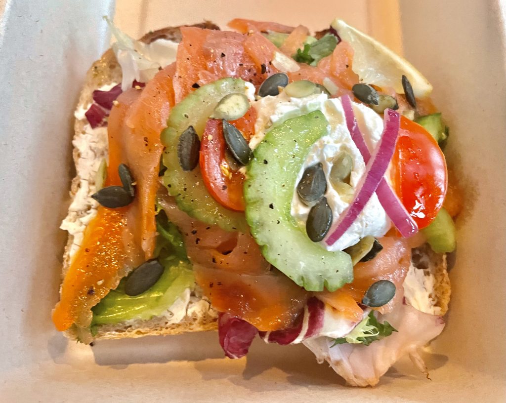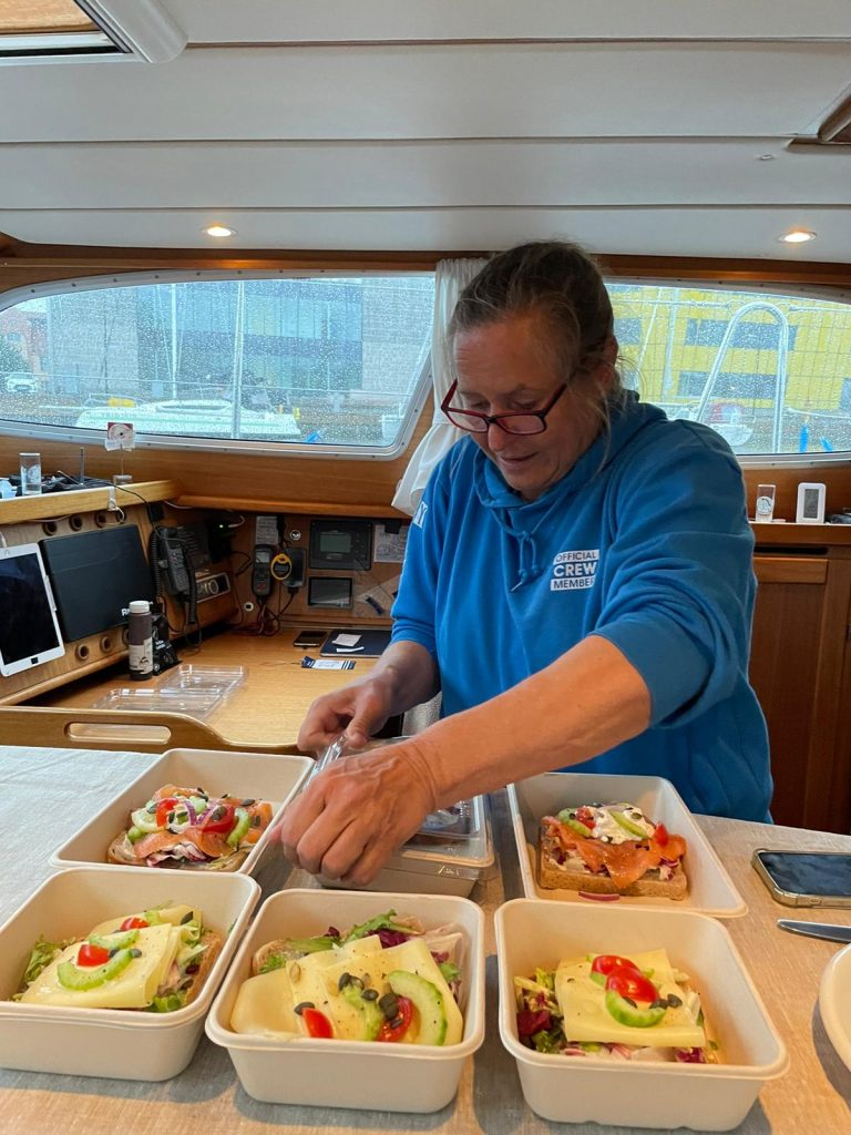 Dann ein unverhoffter Anruf: Mathias ist auf seiner Öland-Tour „zufällig“ an einer von uns sehr empfohlenen kleinen Backstube in Stora Rör vorbeigekommen – Mormors Stenungsbaggeri & Kaffeestuga (Omas Steinofenbäckerei & Kaffeestube) – und fragt, was er denn so mitbringen könnte. Mitbringen? Häh? Wie… mitbringen. Er kauft – gefühlt – den Laden leer und steht eine Stunde später bei uns am Schiff. Volle Tüten mit süßen Teilchen und Kuchen, Brot und Baguette und verschiedene Smørrebrød-Portionen finden den Weg an Bord. Wir sind baff… und freuen uns riesig über den erneuten Besuch. Und natürlich bezieht Mathias gleich wieder „seine“ Koje im Vorschiff, denn bei dem schittigen Wetter macht Autofahren überhaupt keinen Spaß. Da sitzt man doch lieber warm und trocken auf einem Schiff, hört den Regen aufs Dach prasseln und genießt heißen Tee mit Rum… oder auch ohne Tee. Wir bedauern den einen oder anderen Segler, der, in dicke Regensachen eingemummelt, in den Hafen einläuft. Draußen ist es richtig ungemütlich. Außerhalb des geschützten Hafenbereichs kriegen die Regentropfen durch den stürmischen Wind ordentlich Geschwindigkeit. Kein Wetter zum draußen sein. Zum Abendessen gibt es an Bord dann die mitgebrachten, reich belegten leckeren typisch schwedischen Brote. Dann igeln wir uns gemütlich ein. Bei dem Dauerregen geht niemand freiwillig von Bord.