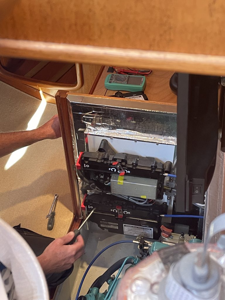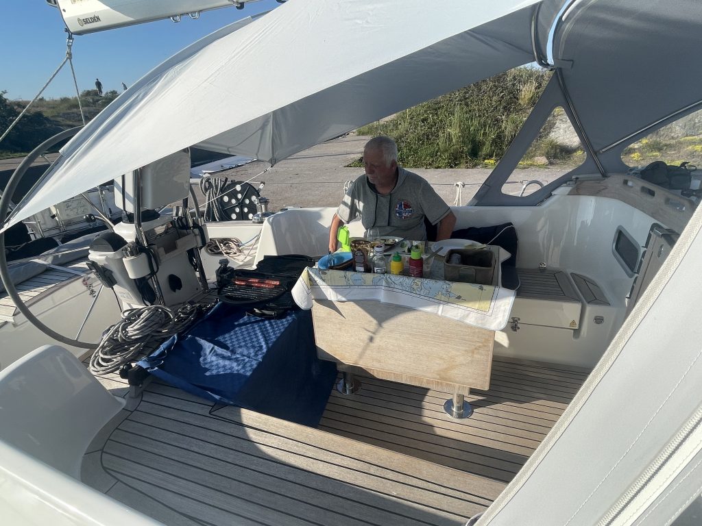 Der Sonntag zeigt sich dann wieder einigermaßen annehmbar: erst bedeckt, doch nach dem Frühstück sogar etwas sonnig. Mathias startet seine Weiterfahrt quer durch Schwedens Inland in Richtung Westküste (auf der Jagd nach Orten mit lustigen Namen) und Kalli macht noch weitere Getriebetests, um am Montag dem Monteur evtl. zusätzliche Hinweise geben zu können. Der Monteur klopft dann auch pünktlich am nächsten Morgen ans Schiff. Wir sind gespannt, was er zu unserem Vorschlag für den möglichen Verlauf der Bowdenzüge sagt. Erst scheint der Weg gangbar, doch bei näherer Betrachtung sind einfach die Endstücke der Bowdenzüge zu steif. An einer Engstelle kommt man einfach nicht vorbei. 😖😡🤬 Dann eben nicht auf manuelle Steuerung umbauen, sondern die elektronische Steuerung ersetzen. Da gibt es – natürlich🤷♀️ – auch ein Problem: die Lieferzeit beträgt 2-8 Wochen. Nun ist es in Kalmar zwar ganz nett, aber sooo nett nun auch wieder nicht. Da hilft dann wohl nur, sich (erstmal) an das Getriebe-Problem zu gewöhnen, weiterfahren und hoffen, dass es nicht noch häufiger auftritt und grade beim Anlegen im Hafen ausfällt. 🥴🤢🤮