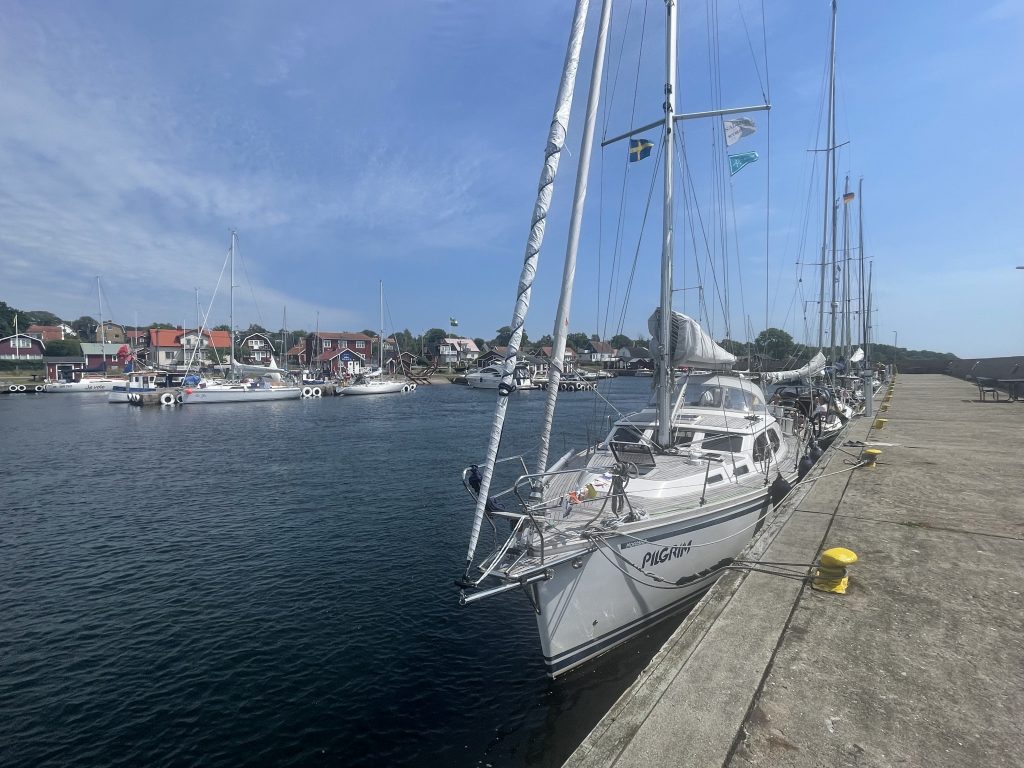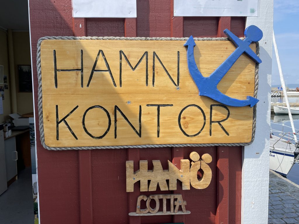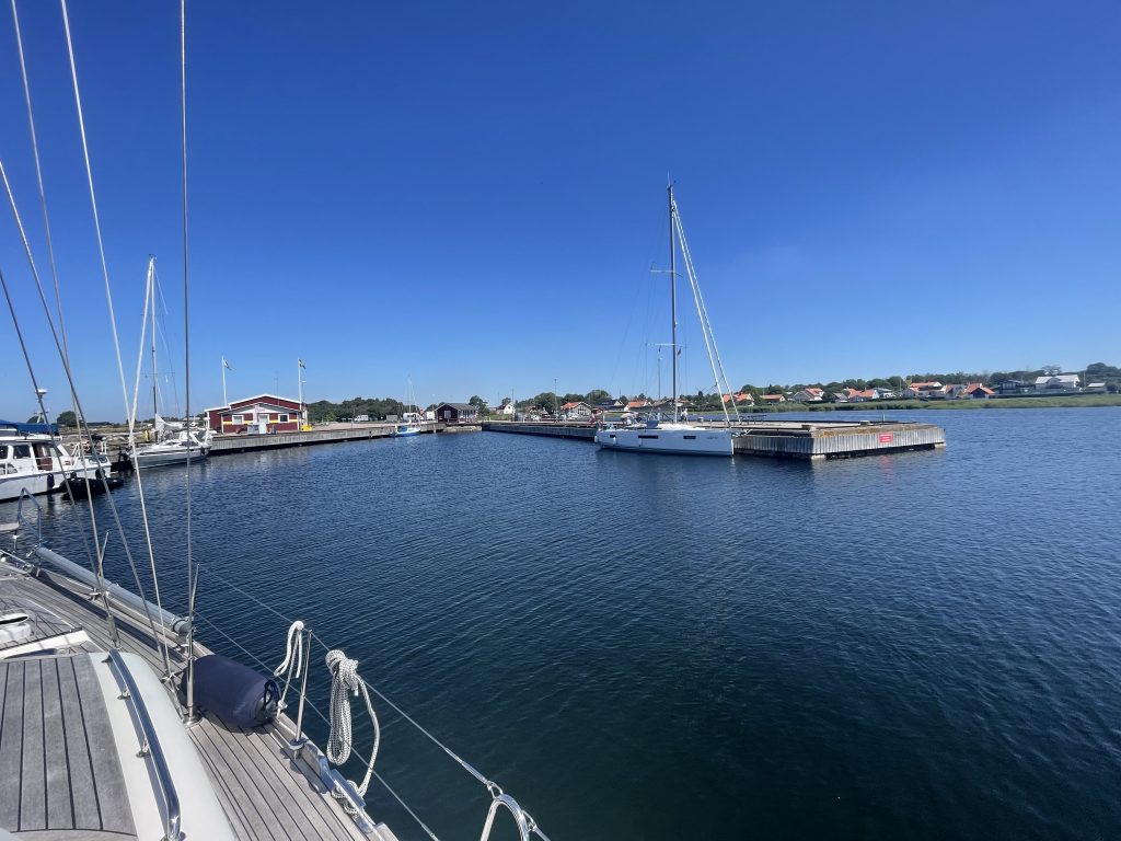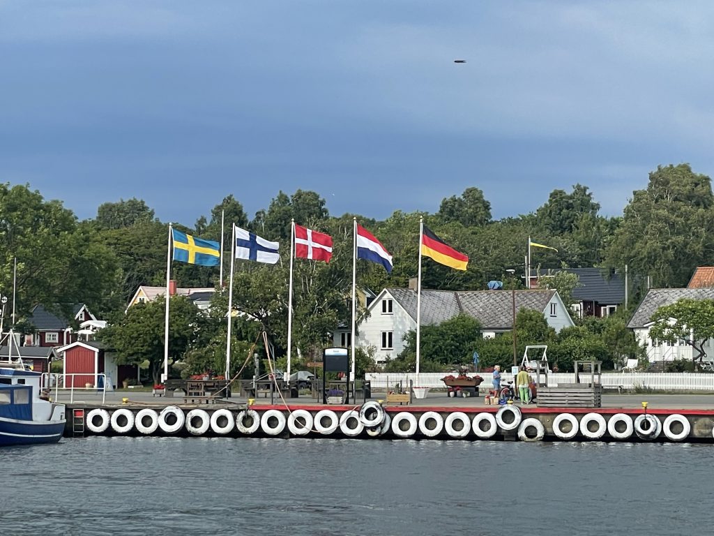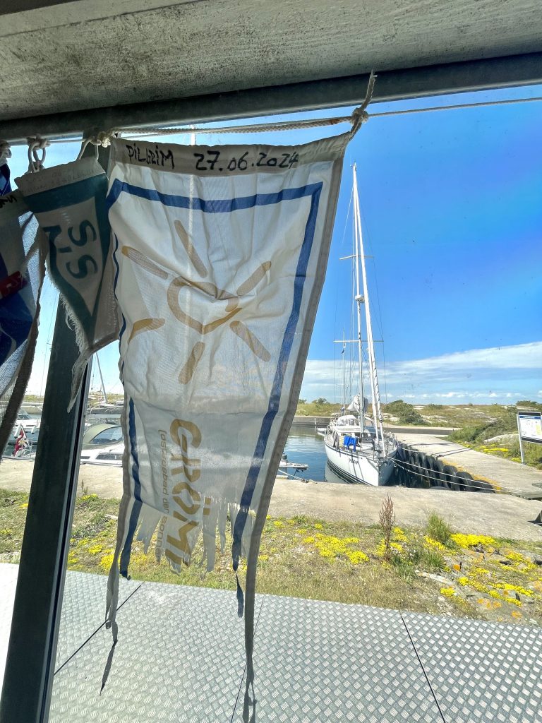 Unser geplant früher Start am nächsten Morgen (Donnerstag, 27.06.24) verzögert sich um drei Stunden, denn die verschiedenen Windvorhersagen hatten ein (uns zu) kräftiges Windfeld wohl irgendwie alle übersehen. Als wir zu unchristlicher Zeit früh morgens den Kopf aus dem Schiff stecken, pfeift es uns nur so um die Ohren. Überhaupt kein Wind zum ablegen… und schon garnicht für eine Strecke von 30 Seemeilen, was für uns etwa 5-6 Stunden Reisezeit bedeutet. Nichts wie wieder unter Deck und eingekuschelt. Eine Reise soll ja Spaß machen. So kommen wir zu etwas mehr Schlaf und verlassen erst um 09 Uhr, gemeinsam mit einigen anderen Seglern, das einsame Felseneiland mit Kurs auf eine andere Insel: Hanö. Hier haben wir vor einigen Wochen schon mal Station gemacht. Heute wird es vermutlich voller werden, denn die Segelsaison ist im Gange. In allen Häfen sind inzwischen deutlich mehr Schiffe als auf unserer nordgehenden Reiseroute. Aber es ist noch nicht übervoll, niemand liegt im Päckchen, sondern die Schiffe liegen einzeln und hintereinander an der langen Mole. Wir machen fest und kommen gleich mit einem netten Schweden ins Gespräch, der uns eine Leine annimmt und dann unsere „Sail more – Work less“-Flagge begeistert fotografiert. Er fragt uns, woher wir sie haben: selbst entworfen! Und noch ein Foto: knips knips.