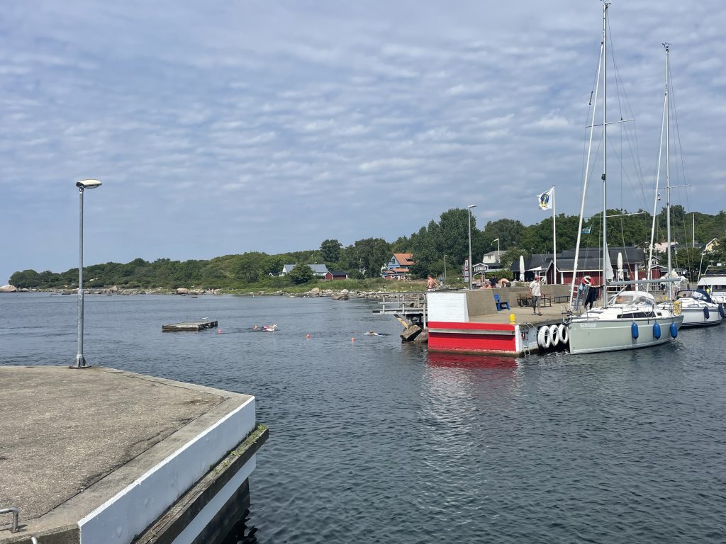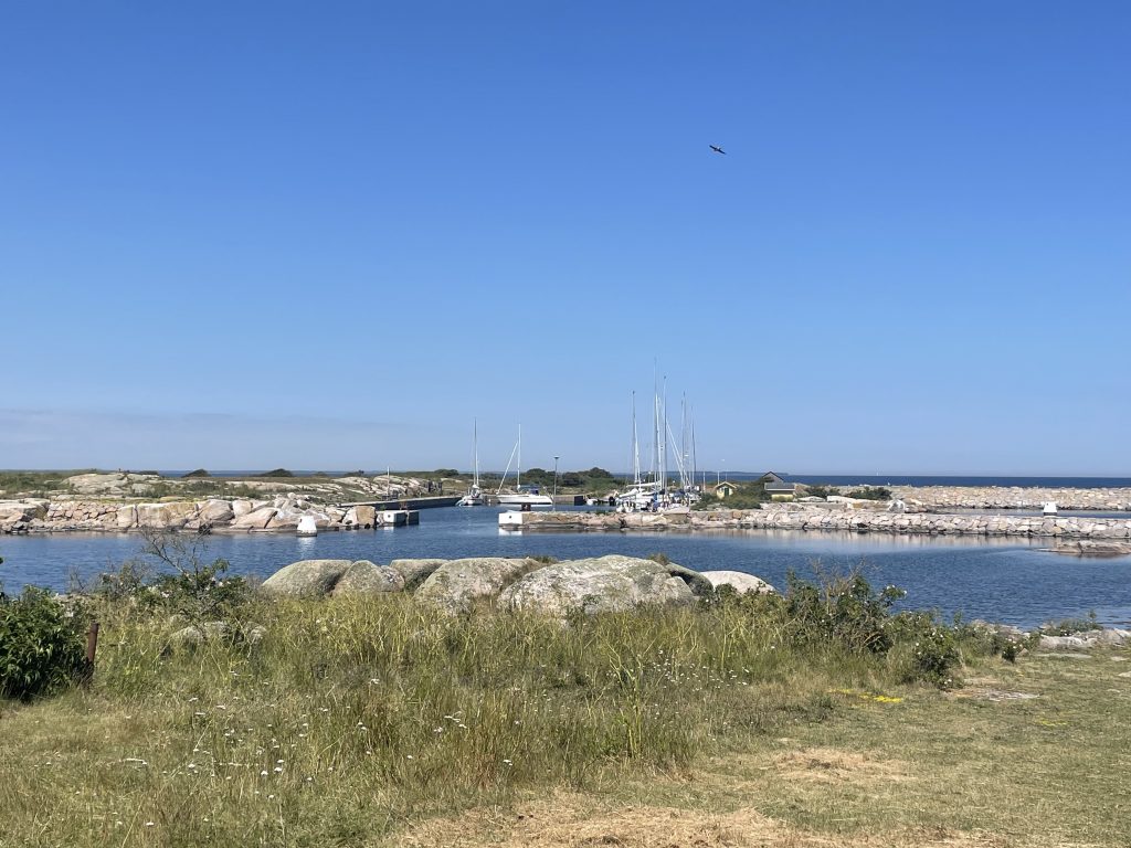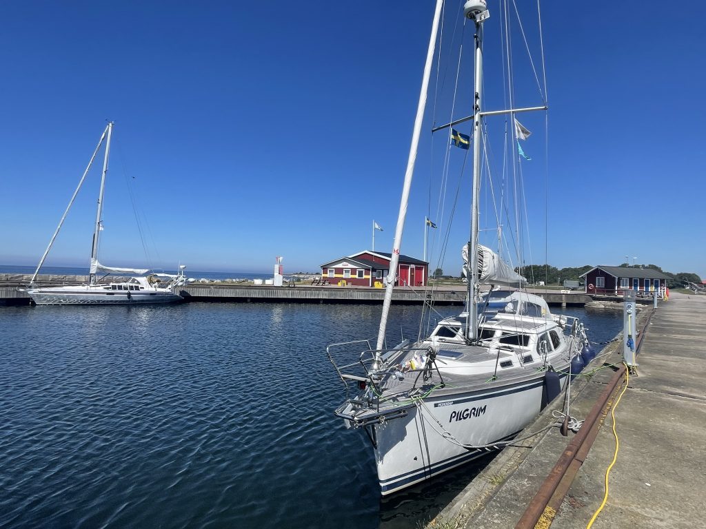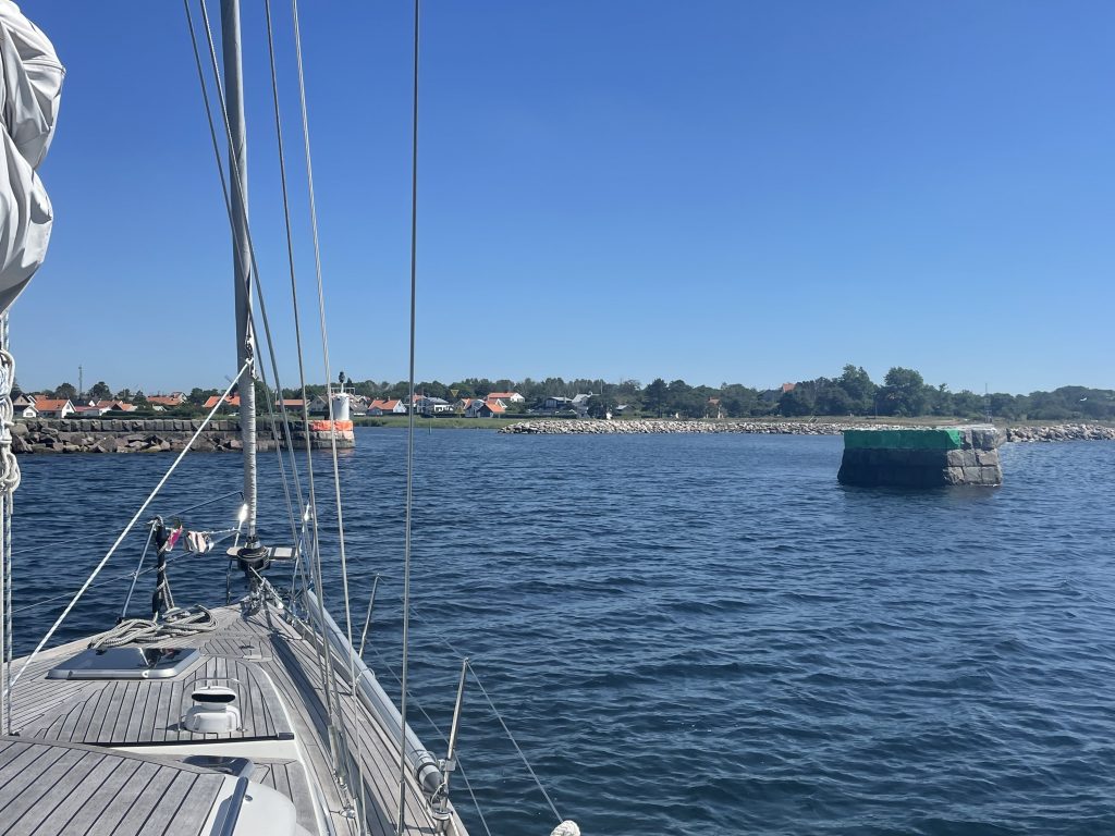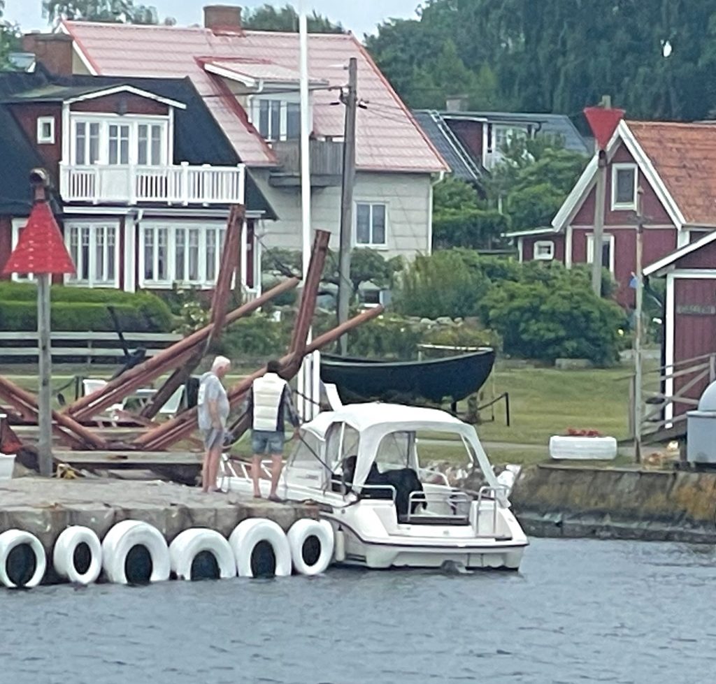 Unser geplant früher Start am nächsten Morgen (Donnerstag, 27.06.24) verzögert sich um drei Stunden, denn die verschiedenen Windvorhersagen hatten ein (uns zu) kräftiges Windfeld wohl irgendwie alle übersehen. Als wir zu unchristlicher Zeit früh morgens den Kopf aus dem Schiff stecken, pfeift es uns nur so um die Ohren. Überhaupt kein Wind zum ablegen… und schon garnicht für eine Strecke von 30 Seemeilen, was für uns etwa 5-6 Stunden Reisezeit bedeutet. Nichts wie wieder unter Deck und eingekuschelt. Eine Reise soll ja Spaß machen. So kommen wir zu etwas mehr Schlaf und verlassen erst um 09 Uhr, gemeinsam mit einigen anderen Seglern, das einsame Felseneiland mit Kurs auf eine andere Insel: Hanö. Hier haben wir vor einigen Wochen schon mal Station gemacht. Heute wird es vermutlich voller werden, denn die Segelsaison ist im Gange. In allen Häfen sind inzwischen deutlich mehr Schiffe als auf unserer nordgehenden Reiseroute. Aber es ist noch nicht übervoll, niemand liegt im Päckchen, sondern die Schiffe liegen einzeln und hintereinander an der langen Mole. Wir machen fest und kommen gleich mit einem netten Schweden ins Gespräch, der uns eine Leine annimmt und dann unsere „Sail more – Work less“-Flagge begeistert fotografiert. Er fragt uns, woher wir sie haben: selbst entworfen! Und noch ein Foto: knips knips.