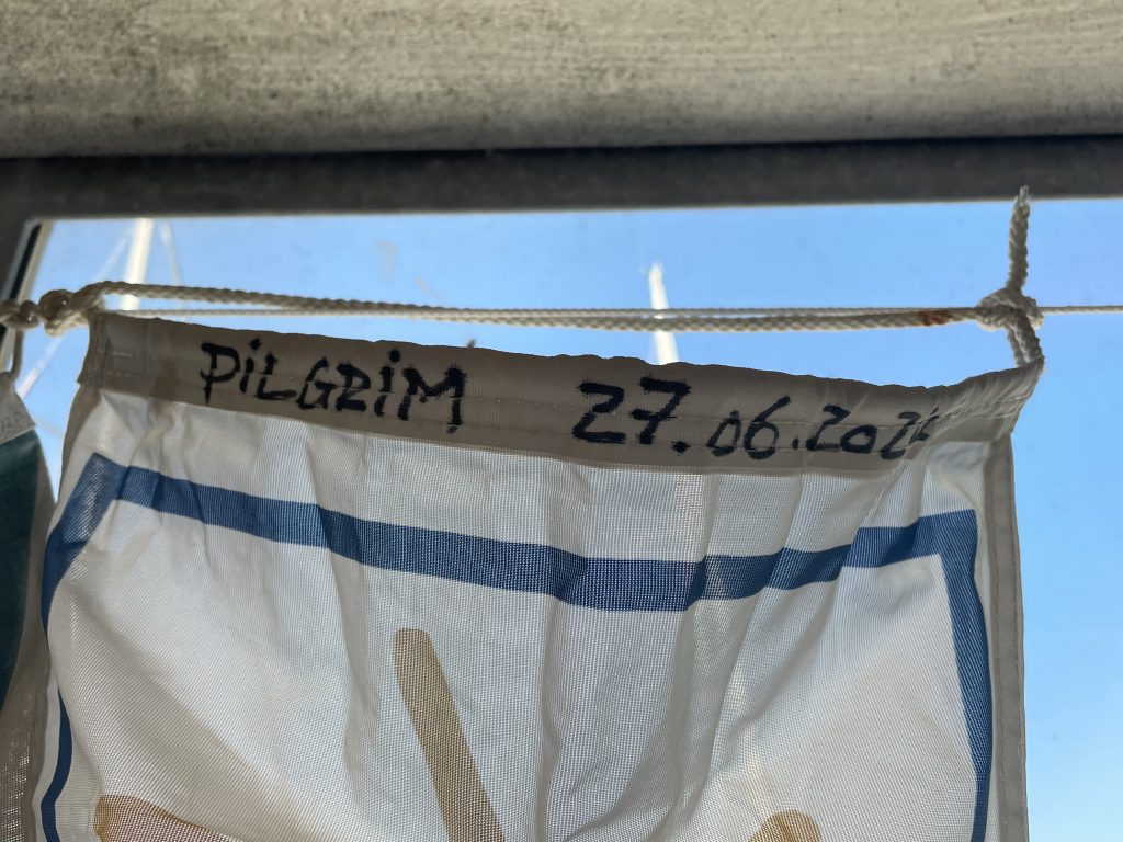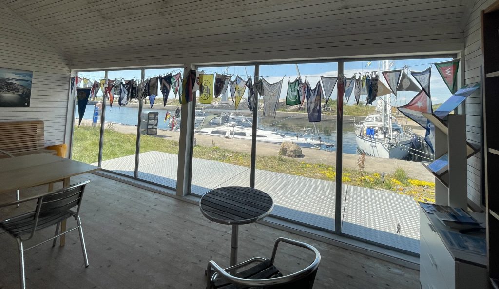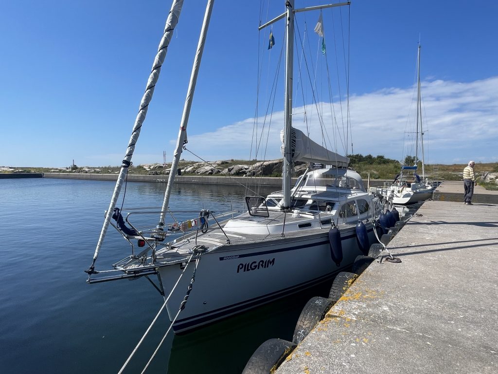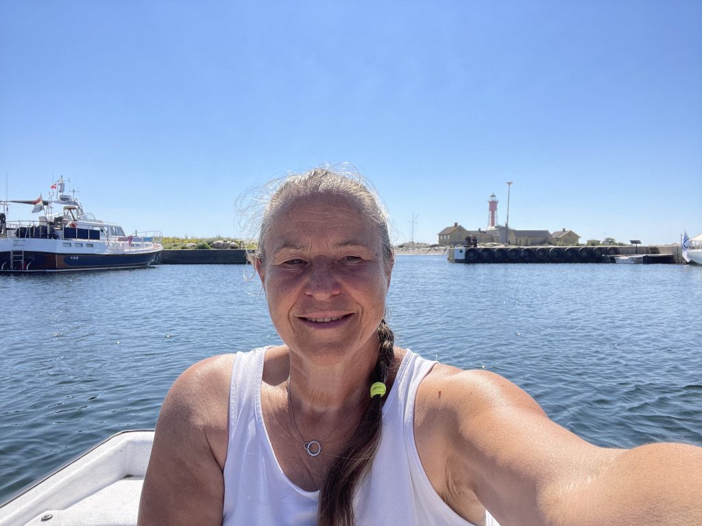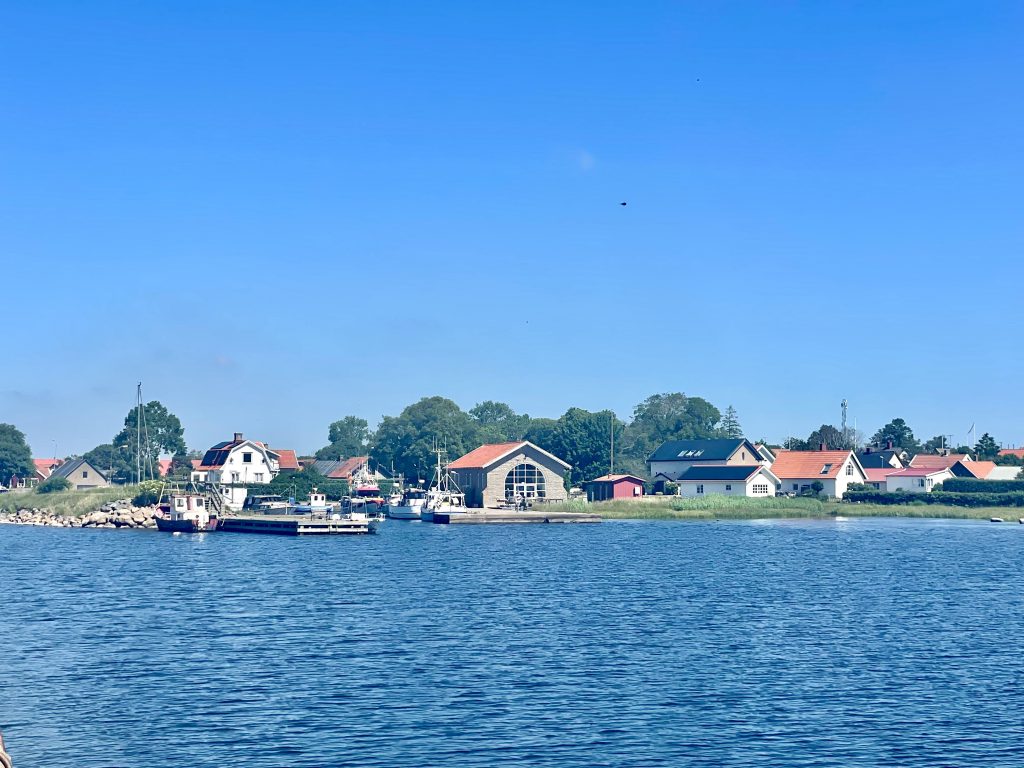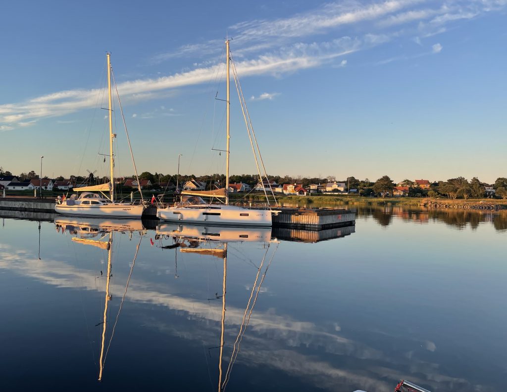Unser geplant früher Start am nächsten Morgen (Donnerstag, 27.06.24) verzögert sich um drei Stunden, denn die verschiedenen Windvorhersagen hatten ein (uns zu) kräftiges Windfeld wohl irgendwie alle übersehen. Als wir zu unchristlicher Zeit früh morgens den Kopf aus dem Schiff stecken, pfeift es uns nur so um die Ohren. Überhaupt kein Wind zum ablegen… und schon garnicht für eine Strecke von 30 Seemeilen, was für uns etwa 5-6 Stunden Reisezeit bedeutet. Nichts wie wieder unter Deck und eingekuschelt. Eine Reise soll ja Spaß machen. So kommen wir zu etwas mehr Schlaf und verlassen erst um 09 Uhr, gemeinsam mit einigen anderen Seglern, das einsame Felseneiland mit Kurs auf eine andere Insel: Hanö. Hier haben wir vor einigen Wochen schon mal Station gemacht. Heute wird es vermutlich voller werden, denn die Segelsaison ist im Gange. In allen Häfen sind inzwischen deutlich mehr Schiffe als auf unserer nordgehenden Reiseroute. Aber es ist noch nicht übervoll, niemand liegt im Päckchen, sondern die Schiffe liegen einzeln und hintereinander an der langen Mole. Wir machen fest und kommen gleich mit einem netten Schweden ins Gespräch, der uns eine Leine annimmt und dann unsere „Sail more – Work less“-Flagge begeistert fotografiert. Er fragt uns, woher wir sie haben: selbst entworfen! Und noch ein Foto: knips knips.