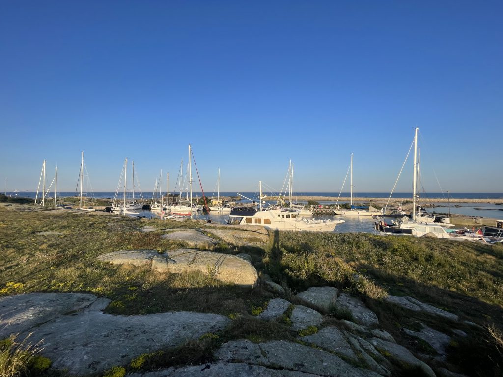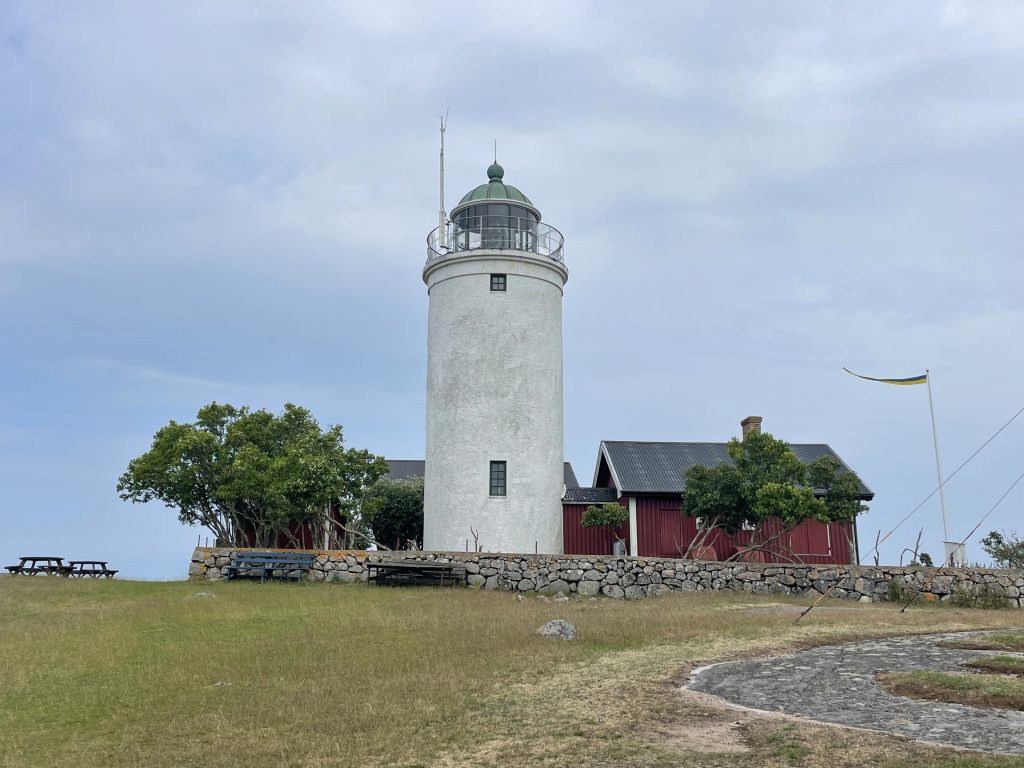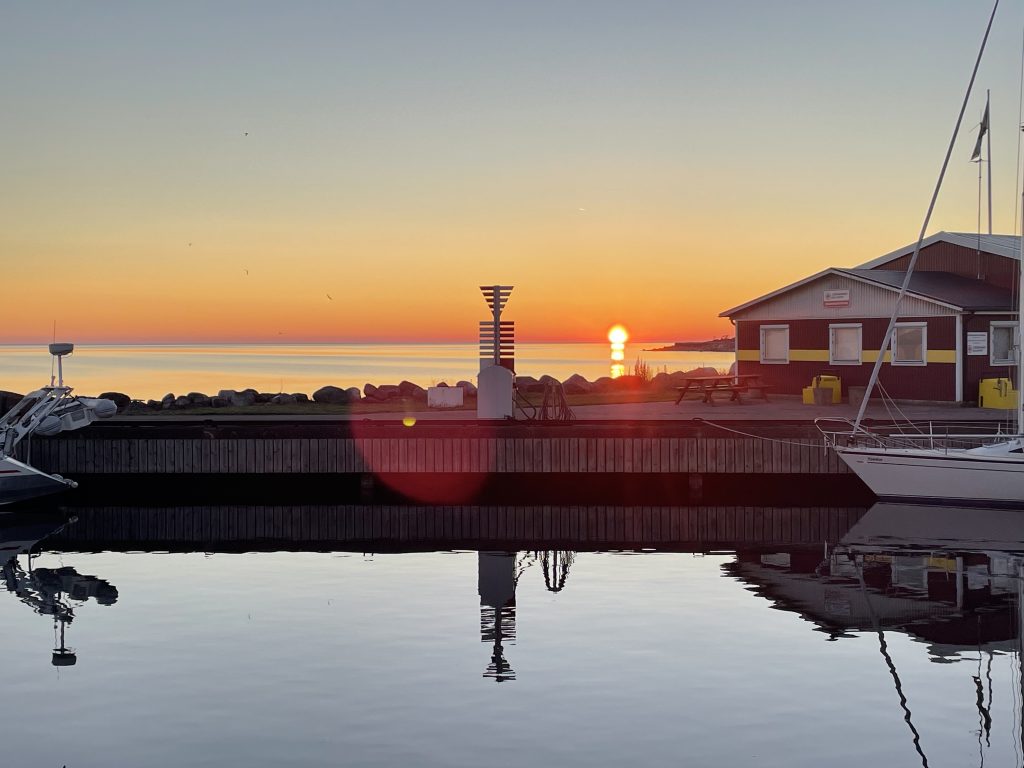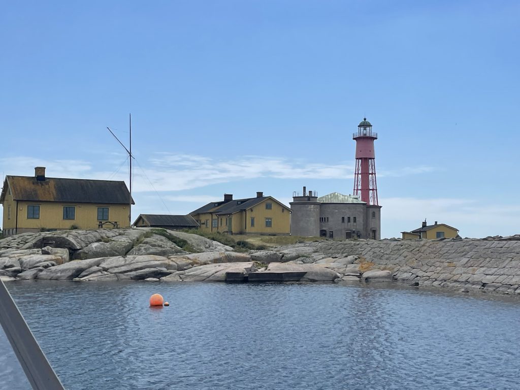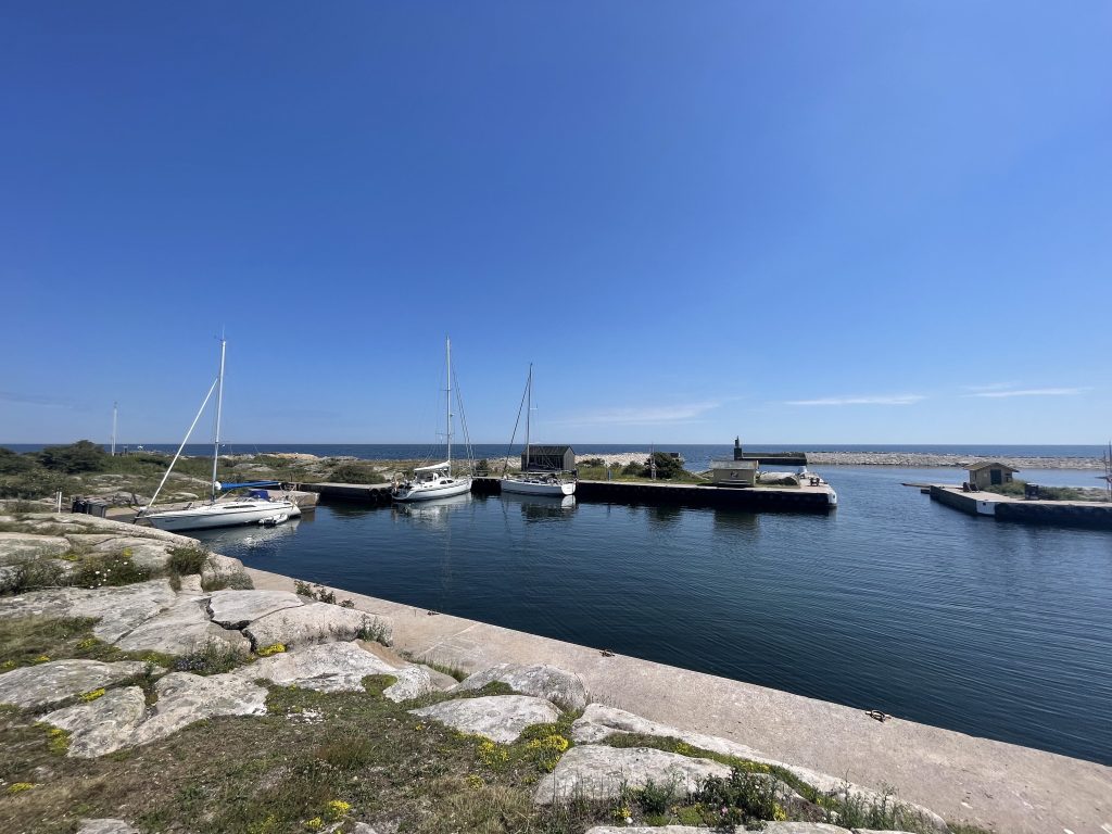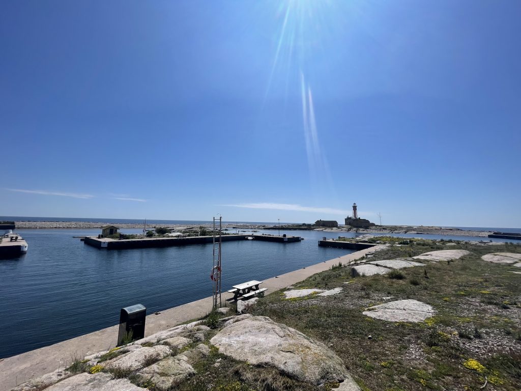 Utklippan ist gerne genutzter Stopp, wenn man z.B. von Bornholm gen Schweden will – oder eben zurück. Am Abend haben sich immerhin 21 Schiffe eingefunden, die Crews genießen den Blick aufs Meer und wir alle freuen uns, dass wir hier auf so einem kleinen Felsen mitten im Nirgendwo sitzen dürfen. Kargheit, Entschleunigung, Natur pur. Nur viele Seevögel und wir. Und einige Robben auf den südlich vorgelagerten Felsen. Leider sind seit Corona die auf der südlichen Schäre stehenden Gebäude ungenutzt. Vorher gab es hier Vogelstation und Jugendherberge. Wer weiß, ob und wann diese wieder geöffnet werden. Und auch das früher mal während der Sommer-Segelsaison hier lebende Hafenmeisters-Paar, das auch gerne frisch gebackene Waffeln angeboten hat, ist Geschichte. Schade… aber wir haben ja unsere Erinnerungen! Immerhin gibt es noch die kleinen Ruderboote, damit man vom Hafenbecken auf die „Leuchtturm-Seite“ übersetzen kann. Der markante rote Leuchtturm wurde schon 2008 geschlossen und es existiert nur noch ein Leitfeuer zur Markierung des örtlichen Seewegs.