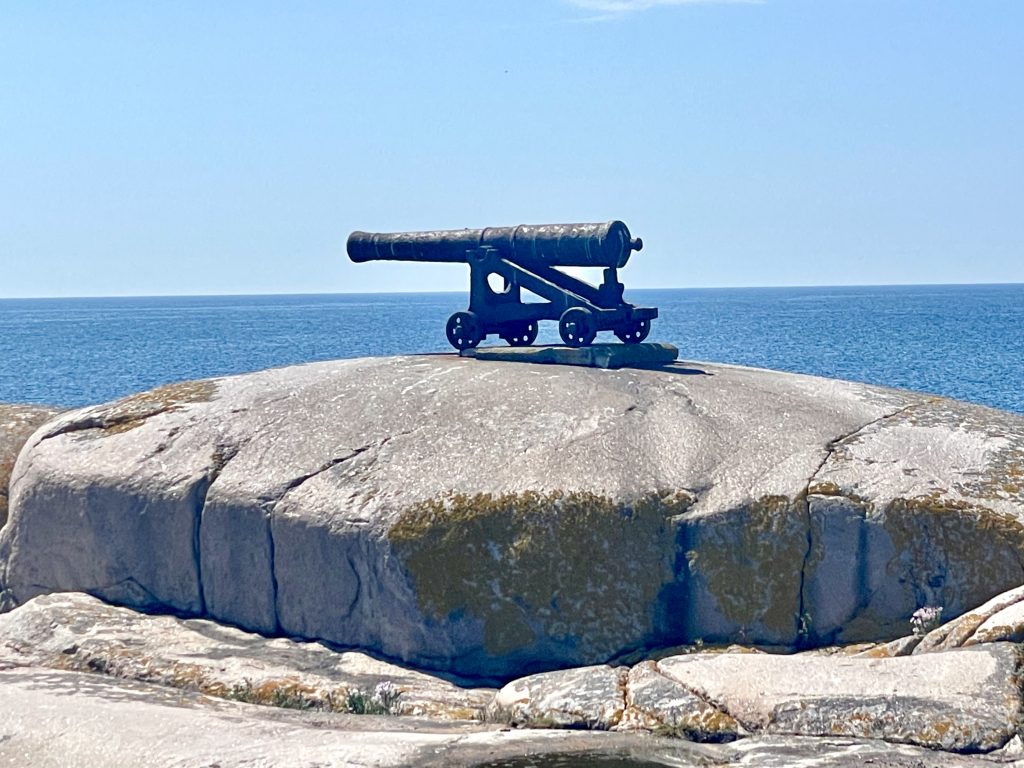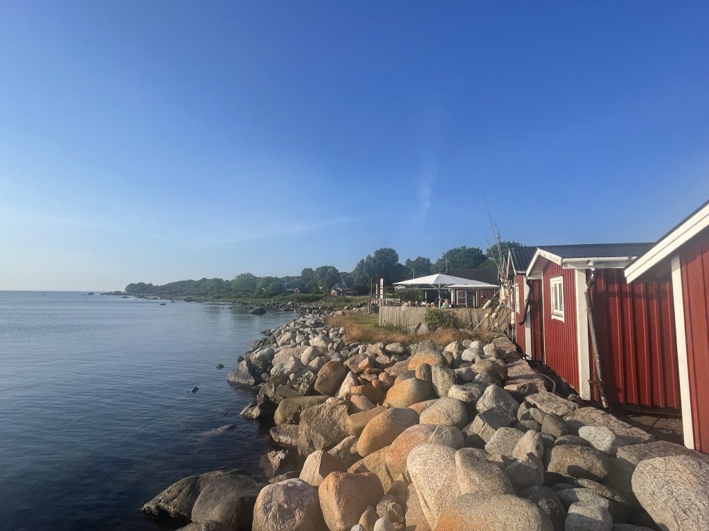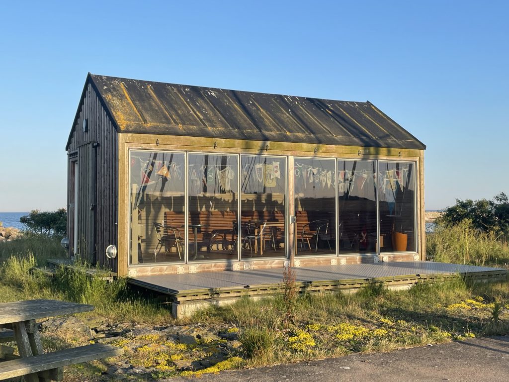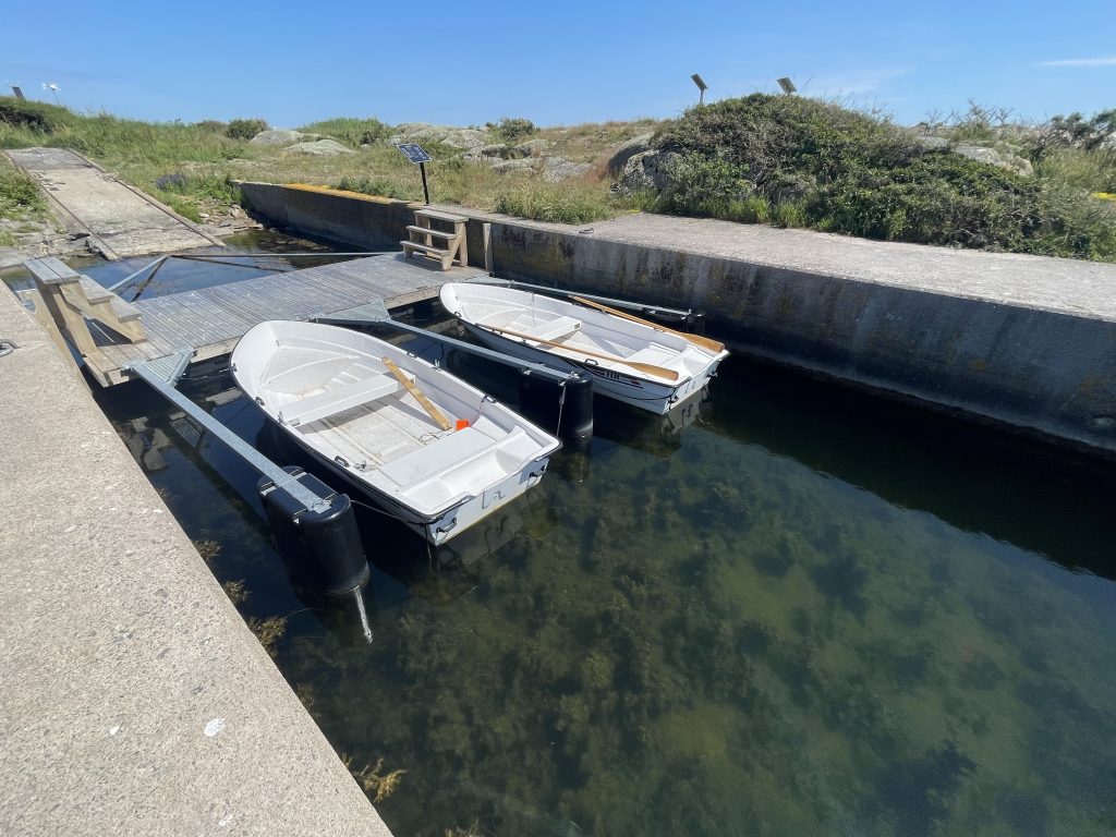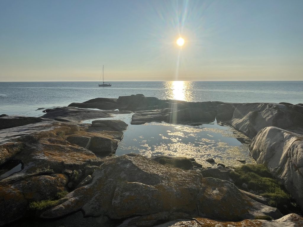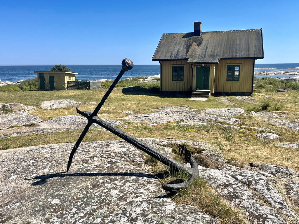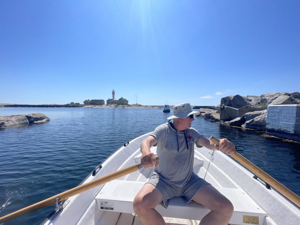 Utklippan ist gerne genutzter Stopp, wenn man z.B. von Bornholm gen Schweden will – oder eben zurück. Am Abend haben sich immerhin 21 Schiffe eingefunden, die Crews genießen den Blick aufs Meer und wir alle freuen uns, dass wir hier auf so einem kleinen Felsen mitten im Nirgendwo sitzen dürfen. Kargheit, Entschleunigung, Natur pur. Nur viele Seevögel und wir. Und einige Robben auf den südlich vorgelagerten Felsen. Leider sind seit Corona die auf der südlichen Schäre stehenden Gebäude ungenutzt. Vorher gab es hier Vogelstation und Jugendherberge. Wer weiß, ob und wann diese wieder geöffnet werden. Und auch das früher mal während der Sommer-Segelsaison hier lebende Hafenmeisters-Paar, das auch gerne frisch gebackene Waffeln angeboten hat, ist Geschichte. Schade… aber wir haben ja unsere Erinnerungen! Immerhin gibt es noch die kleinen Ruderboote, damit man vom Hafenbecken auf die „Leuchtturm-Seite“ übersetzen kann. Der markante rote Leuchtturm wurde schon 2008 geschlossen und es existiert nur noch ein Leitfeuer zur Markierung des örtlichen Seewegs.
