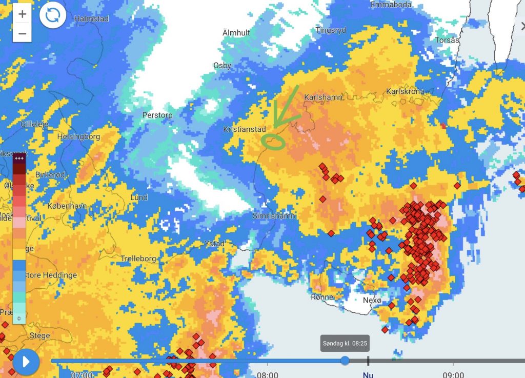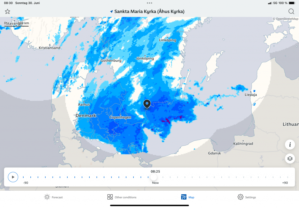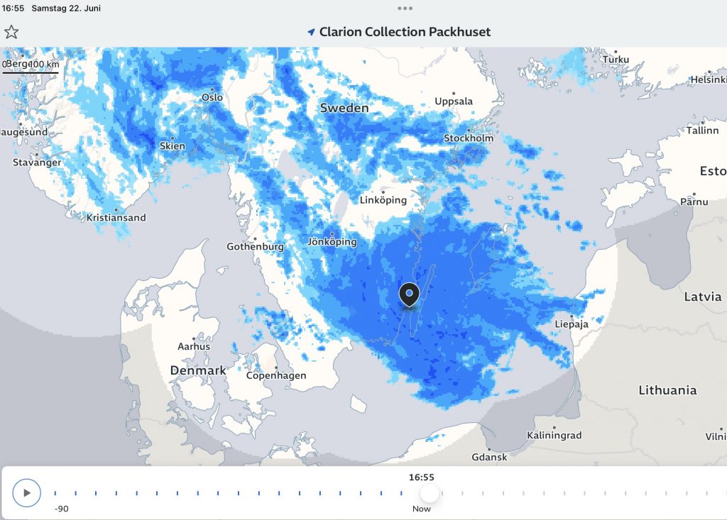 Die Sonne hat sich am Freitag offensichtlich total verausgabt… der Samstagmorgen (22.06.) beginnt erst in einem einheitlichen Grau in Grau, dessen Schattierungen aber über ein trübes Silbergrau zu einem trostlosen Steingrau und dunkleren Mausgrau variieren. Dann beginnt es am späten Vormittag auch noch zusätzlich heftig zu regnen. Muss das denn sein? Schauer waren leider auch schon für die vergangene Nacht vorhergesagt, daher hatten wir am Vorabend – das erste Mal in dieser Saison – unsere Kuchenbude aufgebaut. Welch gute Entscheidung! Es schüttet aus vollen Kübeln. Über ganz Südschweden liegt ein massives Regengebiet.