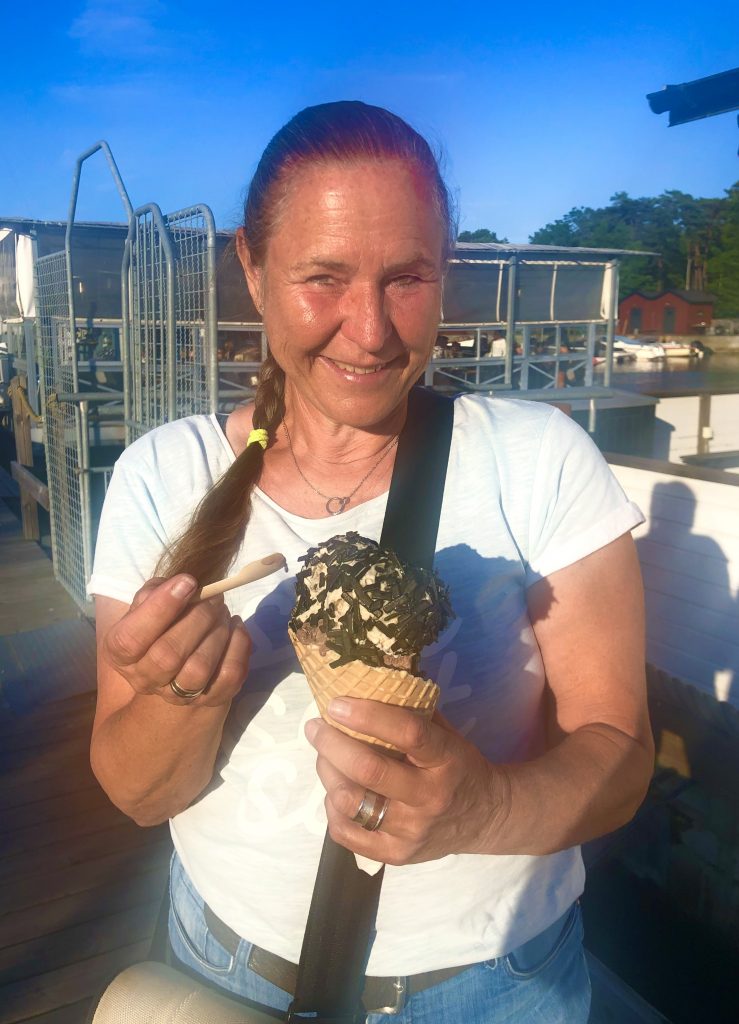 Da morgen der Wind deutlich nachlassen soll und vermutlich die meisten Segler diesen positiven Umstand zur frühen Weiterfahrt nutzen werden, verabschieden wir uns schon mal von den netten Nachbar-Schweden Annika und Dennis und tauschen Adressen aus. Man weiß ja nie… die Welt ist klein. Die Windberuhigung verzögert sich am Samstagmorgen, 29.06. zwar etwas, doch dann tut der Wind, wie vorhergesagt: auf eine angenehme Stärke nachlassen und langsam weiter auf Süd drehen. Das passt uns gut, denn wir haben inzwischen umgeplant und wollen Åhus – der Heimatstadt des ABSOLUT-VODKA – einen Besuch abstatten. Wir sind dann flott unterwegs, brauchen nur zwei Holeschläge, bis der wie gewünscht drehende Wind uns einen Anlieger beschert und kommen zeitig in Åhus an. Dort müssen wir uns erstmal mit der blöden Anlegesituation arrangieren, die wir aber kennen und so erwartet haben. Åhus liegt an der Flussmündung des „Graften“, einem kleinen Nebenarm des Flusses „Helge å“, und man hat immer ein wenig mit Strömung zu tun. Dazukommt, dass die Anlegeplätze für uns reichlich kurz sind und wir ein ziemliches Leinen-Gehäkele haben, bis wir gut und sicher fest sind – Längs-Anlegeplätze gibt es leider nur direkt an der Straße. Da gefällt es uns nicht. Was soll’s… kein Problem. Die verschiedenen Knotentechniken haben wir voll drauf, die Sonne scheint, die Eisbude lockt… wir machen uns gleich auf den Weg zu einem kleinen Rundgang.