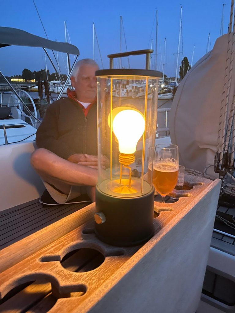 Als am Abend der Wind endlich etwas nachlässt, breitet sich sanfte Ruhe über dem Hafen aus. Wir kuscheln uns ins Cockpit und genießen die besondere Stimmung. Das Wasser schwappt nur leise gegen die Bordwand, kein lautes Plätschern mehr, wie tagsüber. Ruhe und Gelassenheit kehrt ein. Eigentlich ist es die richtige Stimmung für leise Musik mit dem Akkordeon. Doch irgendwie bekomme ich den Dreh nicht, sorry, es muss in seiner Ecke liegen bleiben und auf den Einsatz an einem anderen Tag warten. Wir lauschen nur den sanften Tönen der einbrechenden Nacht… alles ist so schön friedlich… und im warmen Licht unserer Lampe klingt der Tag entspannt aus, während wir Pläne für den nächsten Tag machen.
