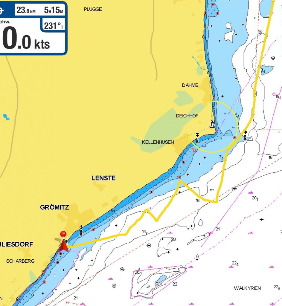 Der Wind macht heute mal wieder, was er will. Aber das Wetter ist ansonsten toll… sogar Kalli startet zum ersten Mal in kurzen Hosen in den Tag. Der Wind hat von NordNordWest 5 bis SüdWest 2 – in dauerndem Wechsel – alles im Angebot. Wir starten mit einem Reff im Großsegel und können unseren Kurs auch gut anlegen. Die wenigen Wellen machen uns nichts aus, nur der Wind ist schon sehr wechselhaft. Nach einiger Zeit scheint er sich etwas zu beruhigen, um gleich darauf wieder kräftige Böen ins Segel zu schicken. Das bringt uns zwar gut voran, aber etwas blöd ist es schon. Aufpassen ist angesagt. Nach einer Weile können wir aber doch ausreffen und unser Großsegel in voller Länge nutzen. Unsere Track-Linie darf man allerdings heute nicht anschauen… ist etwa der Skipper besoffen? Der Kurs muss ständig angepasst werden. Mal etwas nach steuerbord… dann wieder etwas nach backbord. Doch stetig kommen wir Grömitz näher, auch wenn wir anschließend einige Kreuzschläge im Kielwasser haben. So ein Zickzack ist zwar nicht unbedingt Kallis bevorzugte Segelstrecke, aber wenn es schon nach Hause geht, dann möchte ich wenigsten länger segeln, und das heißt heute: kreuzen und auf fast jeden Winddreher reagieren.