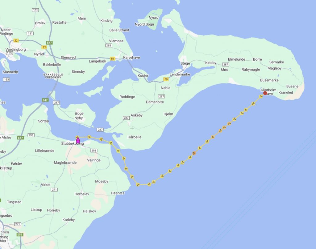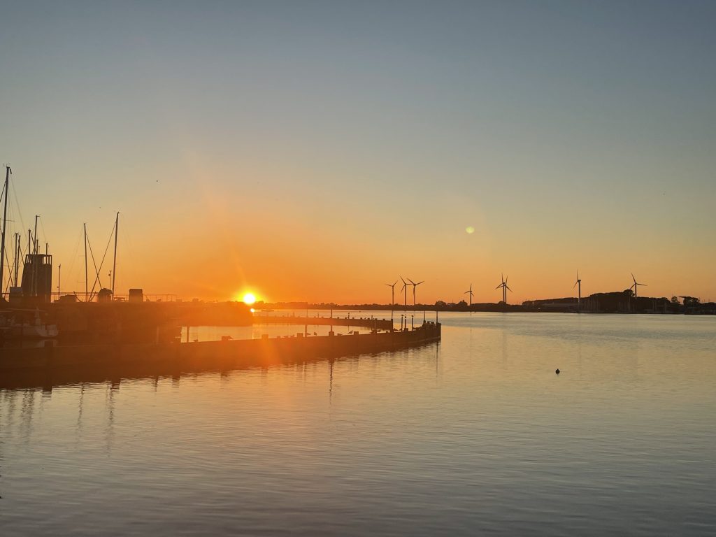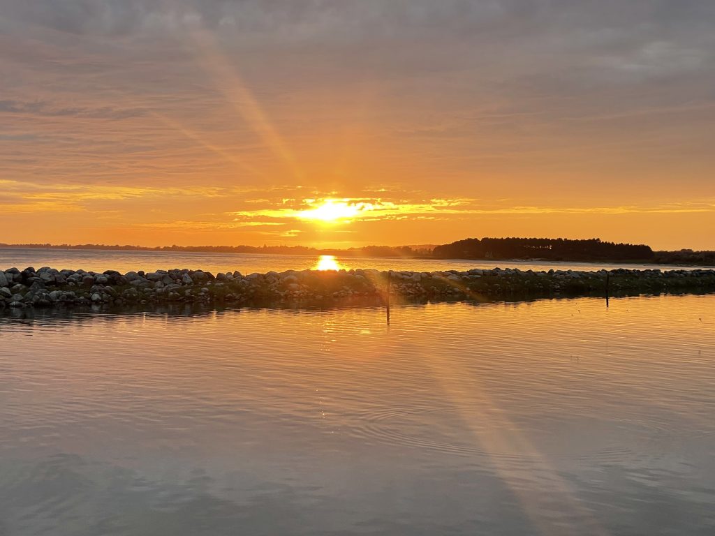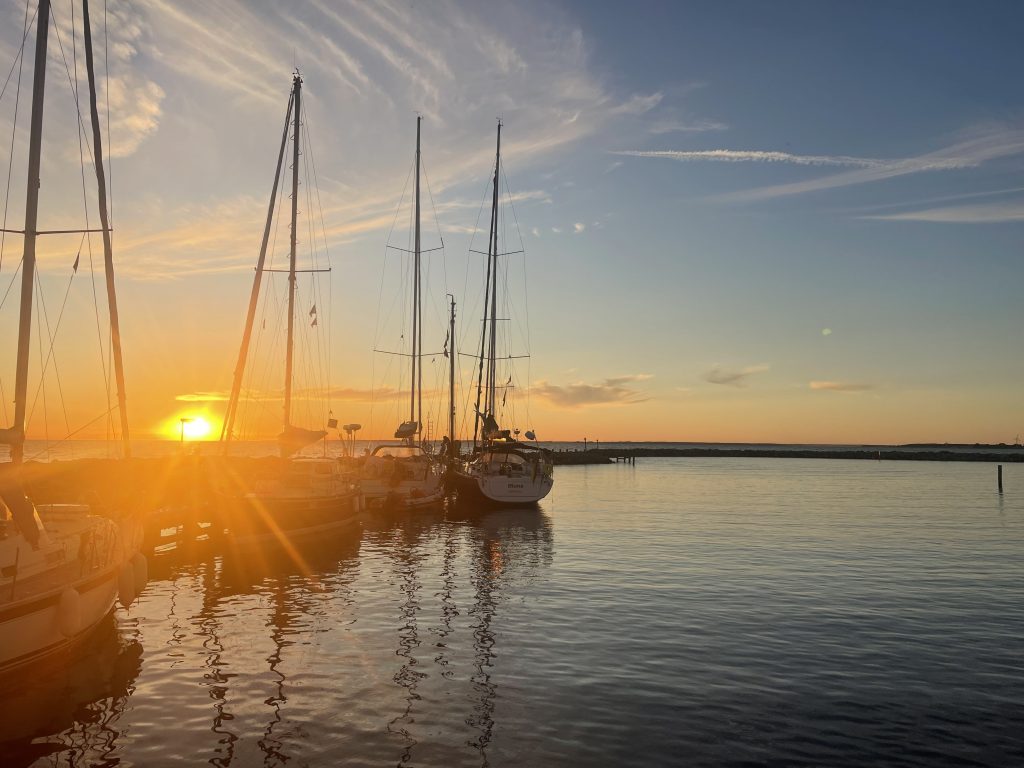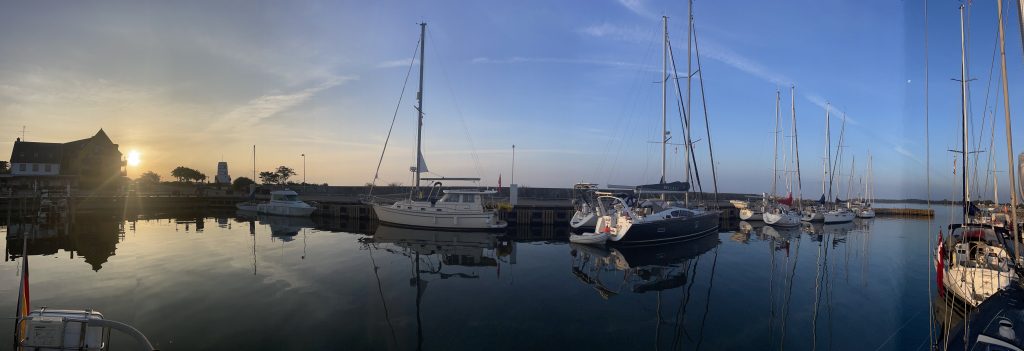 Wir verlassen Rødvig mit einem wehmütigen Blick gen aufgehende Sonne und sehen in entgegengesetzter Richtung den noch recht vollen Mond langsam am Himmel verblassen… alles ist so friedlich. Erst einmal motoren wir gemächlich unserem nächsten Ziel entgegen: Klintholm. Dort waren wir vor einigen Wochen schon einmal und nun werden wir sehen, ob es in den Häfen wirklich etwas ruhiger und leerer wird. Klintholm ist dafür ein guter Indikator, da es ein beliebter Absprunghafen nach Schweden – in Richtung Ystad – oder eben in den Norden – nach Kopenhagen und den Öresund – ist… oder auch wieder von dort zurück. Unterwegs nutzen wir die Zeit für etwas Buchhaltung, Stricken, Blog schreiben… was man halt so macht, wenn der Autopilot brav den Kurs hält.