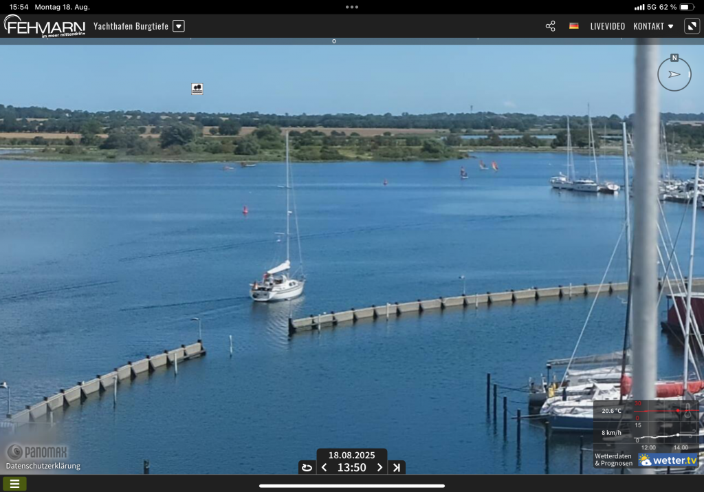 Viele Schiffe laufen an diesem Tag im Hafen ein – etliche wurden offenbar vom plötzlich auffrischenden Wind überrascht oder hatten ihre Etappe einfach nicht optimal geplant. Man muss schon VOR dem Start in den Tag mal in die Windvorhersage schauen. Und auch wenn der Wind nicht auf die Stunde korrekt vorhergesagt werden kann, gibt es doch immerhin eine Tendenz. Und in der sieht man auch durchziehende Starkwindfelder. Mit dieser Angabe kann man ja planen. Das ändert dann zwar nichts am plötzlich zu kräftig einfallenden Wind – falls er doch etwas eher kommt als vorhergesagt – doch man ist wenigstens nicht überrascht und kann sich entsprechend vorbereiten.