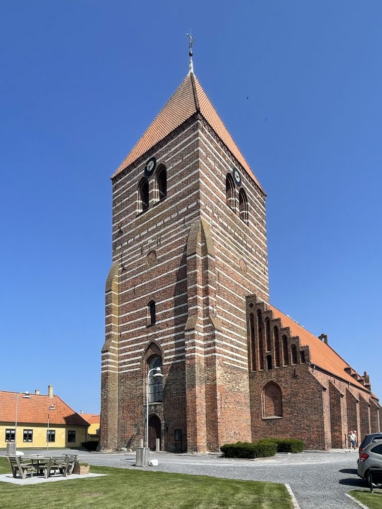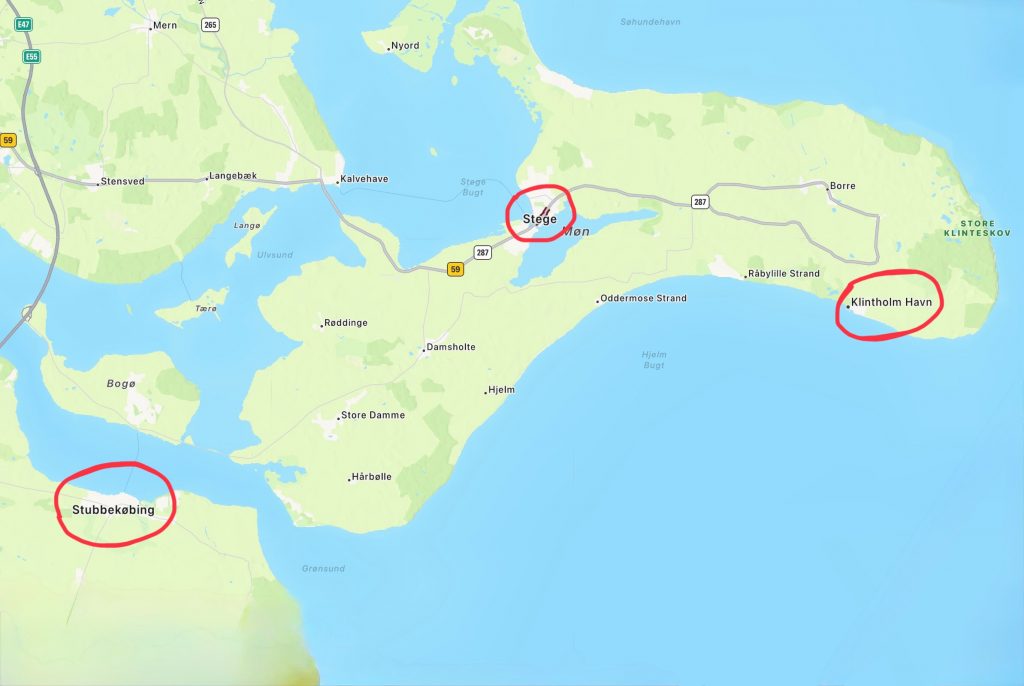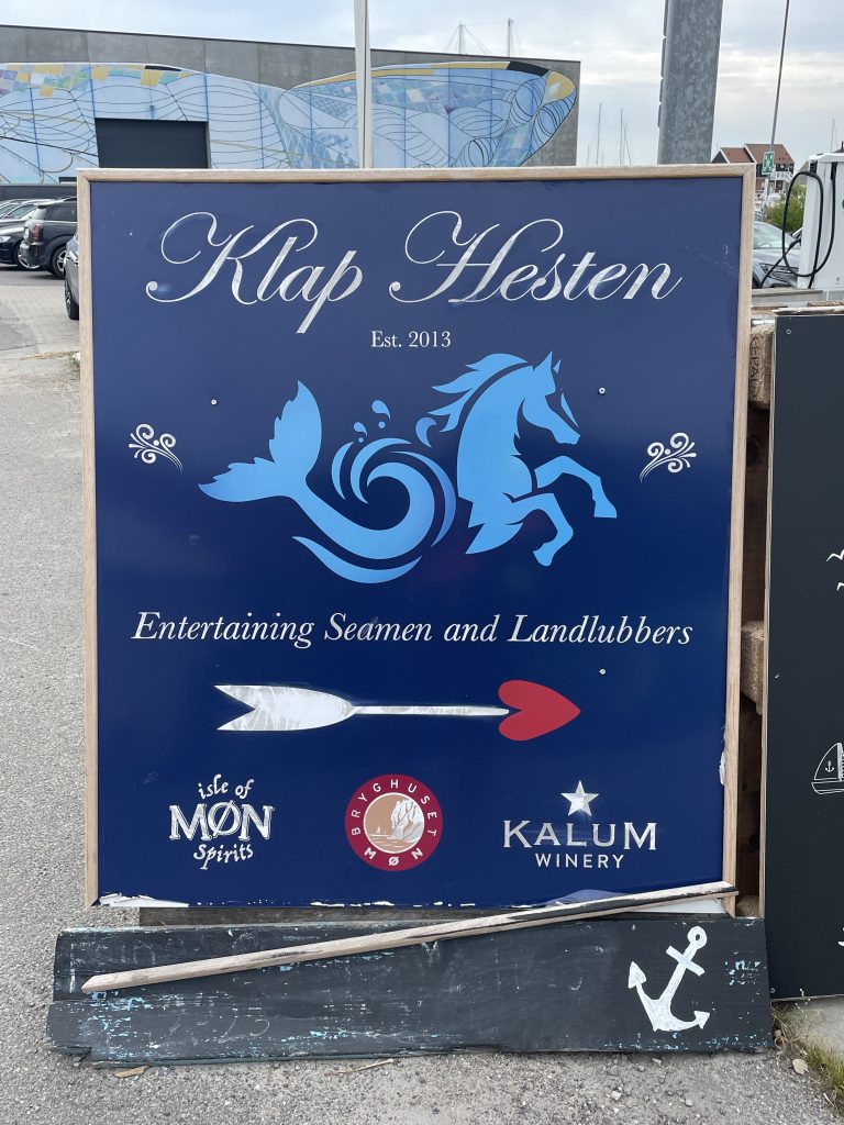 Am nächsten Morgen (Freitag, der 15.8.25) begrüßt uns der angekündigte starke Westwind, pfeift heftig durch den schmalen Sund und bringt das Wasser gewaltig zum Strömen. Aus der geplanten Minikreuzfahrt mit Mathias – einmal nach Vejrø segeln und zurück – wird leider nichts. Stattdessen hat Mathias eine super Idee: er kutschiert uns mit dem Auto nach Stege, dem Hauptort der Insel Møn. Das ist die Insel, auf der auch Klintholm liegt – nur an der anderen Seite. Mit unserem Schiff kommen wir dort nicht hin, da die Fahrwasser stellenweise zu flach und auch eine Brücke mit 20m Durchfahrtshöhe – wir brauchen 19,70m – reichlich knapp bemessen ist. Wenn dann der Wasserstand etwas höher ist… 🥴