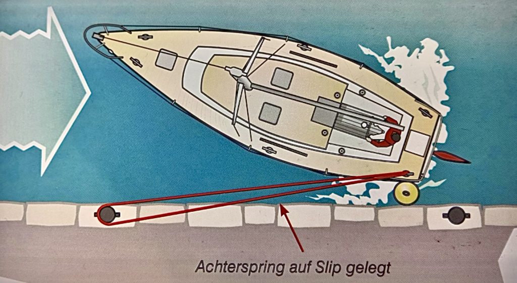 Für die, die es interessiert, hier das Prinzip des Ablegens mit eindampfen in eine Achterspring: eine Leine wird vom Heck des Schiffes nach vorne auf den Steg geführt, aber so, dass sie dort zwar fest gehalten, aber auch schnell gelöst werden kann. Alle anderen Leinen können eingeholt werden. Achtern am Schiff, zur Pier hin, muss natürlich gut abgefendert werden, damit es später keine Kratzer gibt – das hatten wir ja schon. Nun das Ruder zum Steg einschlagen und langsam in Rückwärtsgang. Die Leine spannt sich, das Schiff kann nicht zurück, das Heck bewegt sich zum Steg – ist ja aber gut abgefendert – und der Bug schwenkt vom Steg weg. Jetzt einige Zeit weiter in die achterliche Leine eindampfen, bis sich der Bug weit genug vom Steg entfernt hat. Dann das Ruder umlegen vom Steg weg, vorwärts Gas geben und die Achterspring lösen. Und schon ist man frei vom Steg. Voila!