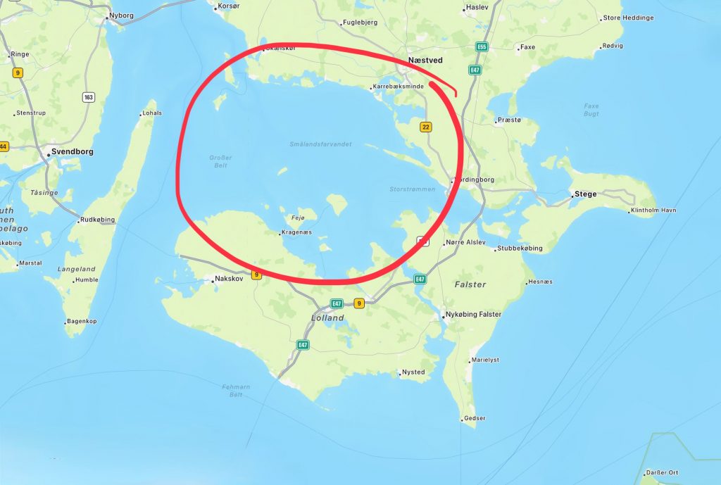 Am Dienstag, den 12. August 25, begrüßen uns die aufgehende Sonne zur einen und der untergehende Mond zur anderen Blickrichtung. Beides etwas von Schleierwolken verdeckt. Irgendwie ein wenig mystisch. Leider ist mal wieder mit wenig bis keinem Wind zu rechnen. Doch in den nächsten Tagen soll sich die Wetterlage ändern: Ostwind ist vorhergesagt. Erst natürlich wieder mal reichlich (zu) viel, aber dann schwächt er sich auf ein angenehmes Maß ab. Das ist dann unser Wind ins Smålandsfahrwasser, das große Seitengewässer des Großen Belts (auf dem unteren Foto rot eingekringelt). Es ist umgeben von den großen dänischen Inseln Seeland, Lolland, Falster und Møn. In diesem meist nur 10m flachen Gewässer liegen verschiedene kleine Inseln, von denen wir evtl. noch die eine oder andere besuchen werden. Nicht alle haben Häfen, die für uns tief genug sind. Mal schauen, wohin uns der Wind führt.