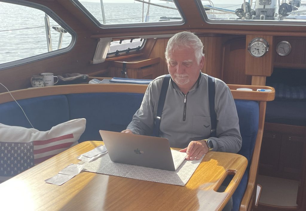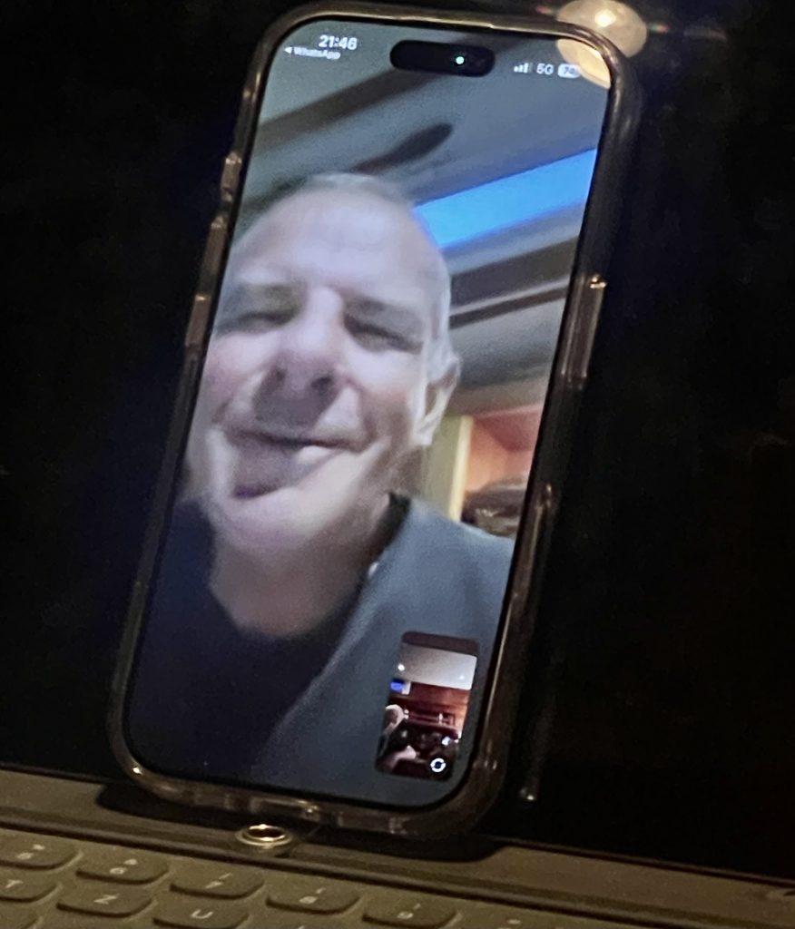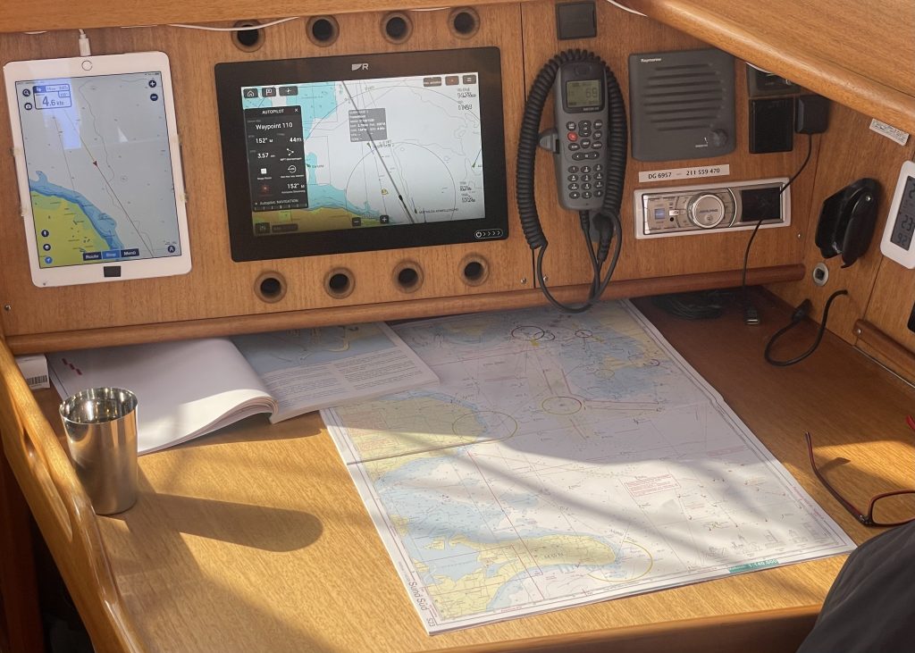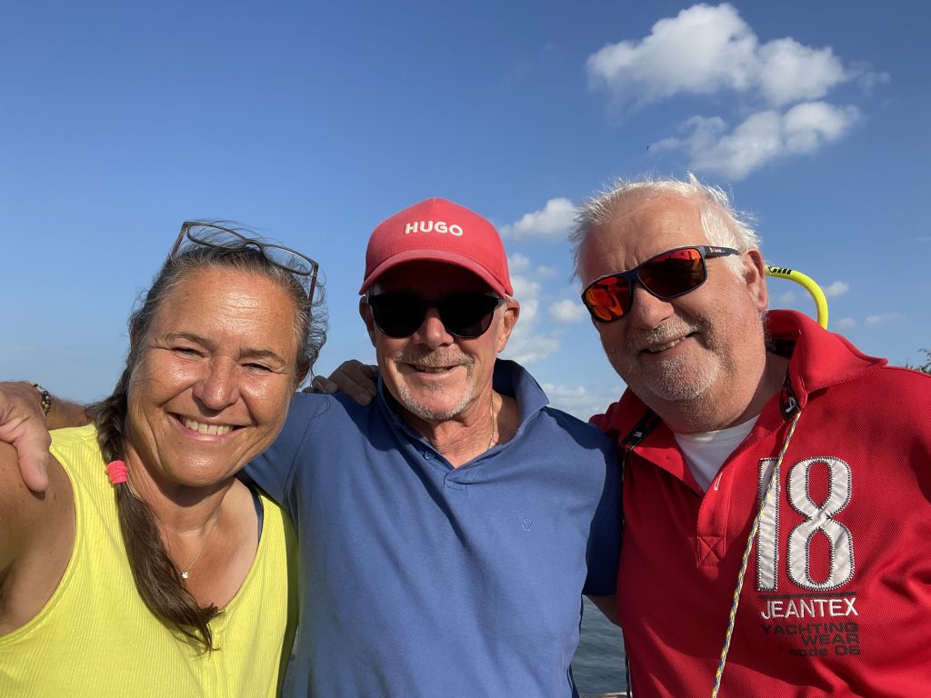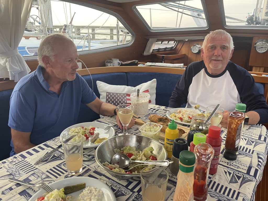 Am Abend – der Wind hat mal grad wieder kräftig zugelegt – trudelt unser Freund Mathias ein, um uns für ein paar Tage an Bord Gesellschaft zu leisten. Die Wiedersehensfreude ist groß, auch wenn wir das geplante Grillen lieber unter Deck verlegen. Draußen weht einem ja die Wurst vom Teller. Wir haben einen fröhlichen Abend und nutzen die Zeit für einen Whatsapp-Anruf bei unserem Freund Ulli. Schade, dass er so weit weg ist. Er segelt noch durch die ostschwedischen Schären, bewegt sich aber wieder gen Süden und kommt der Heimat langsam näher. Mathias und Ulli kennen sich vom letzten Jahr in Västervik und haben damals bei uns an Bord um die Schlafkoje geknobelt 😉: Hundekoje oder Vorschiff, das war damals die Frage. Heute ist klar: Mathias bekommt das Vorschiff (wie damals😴).