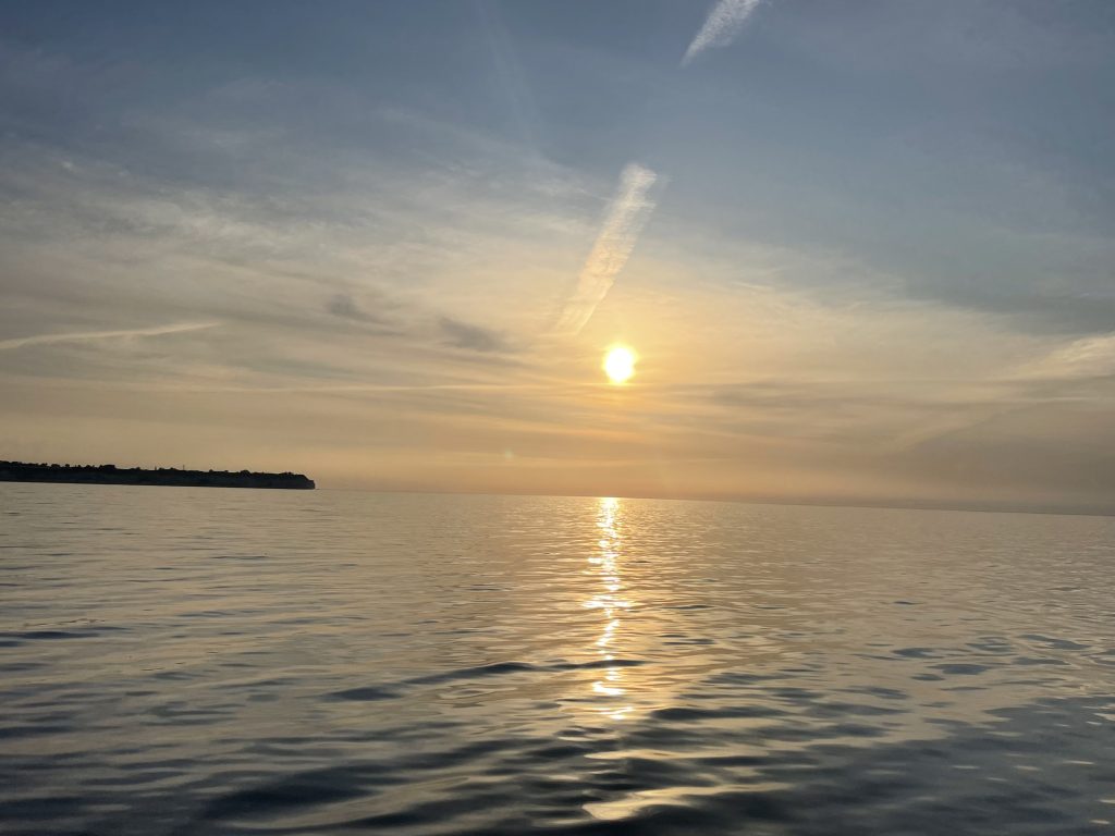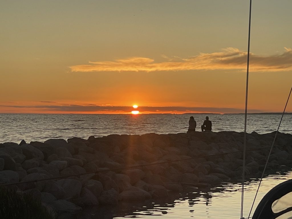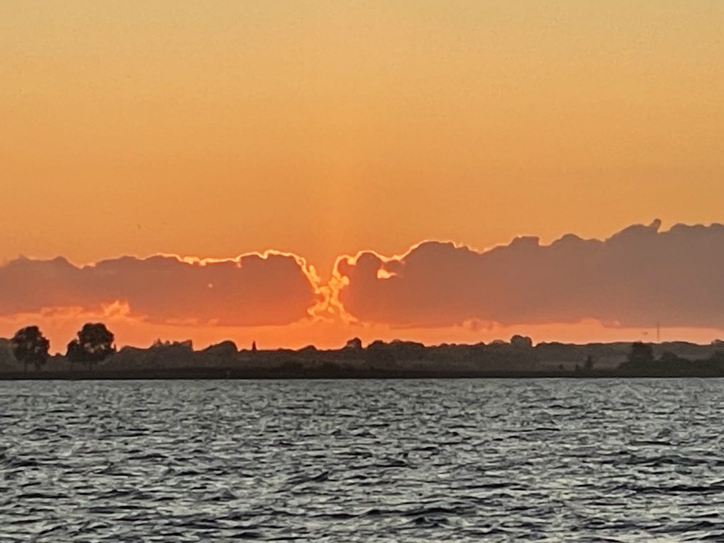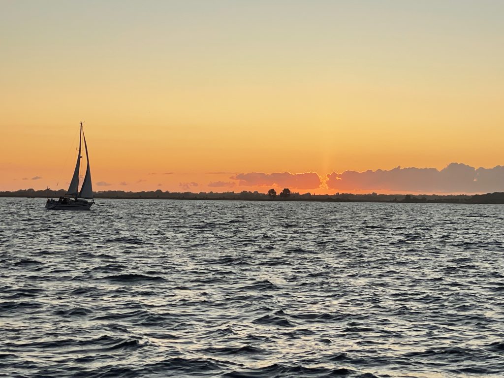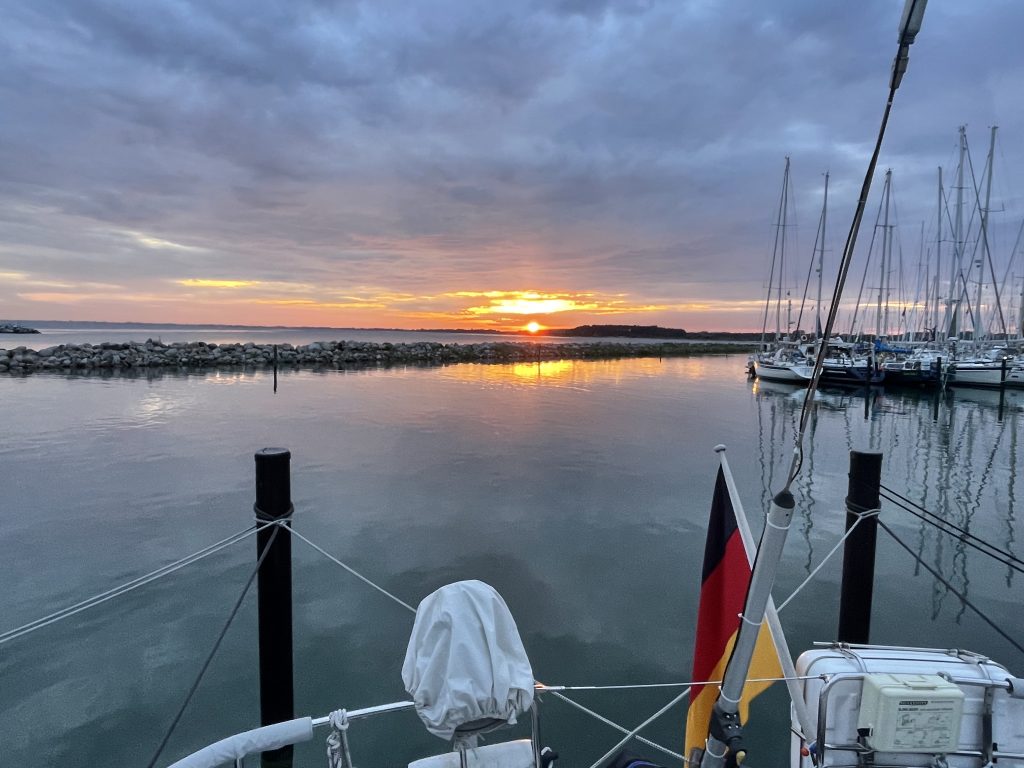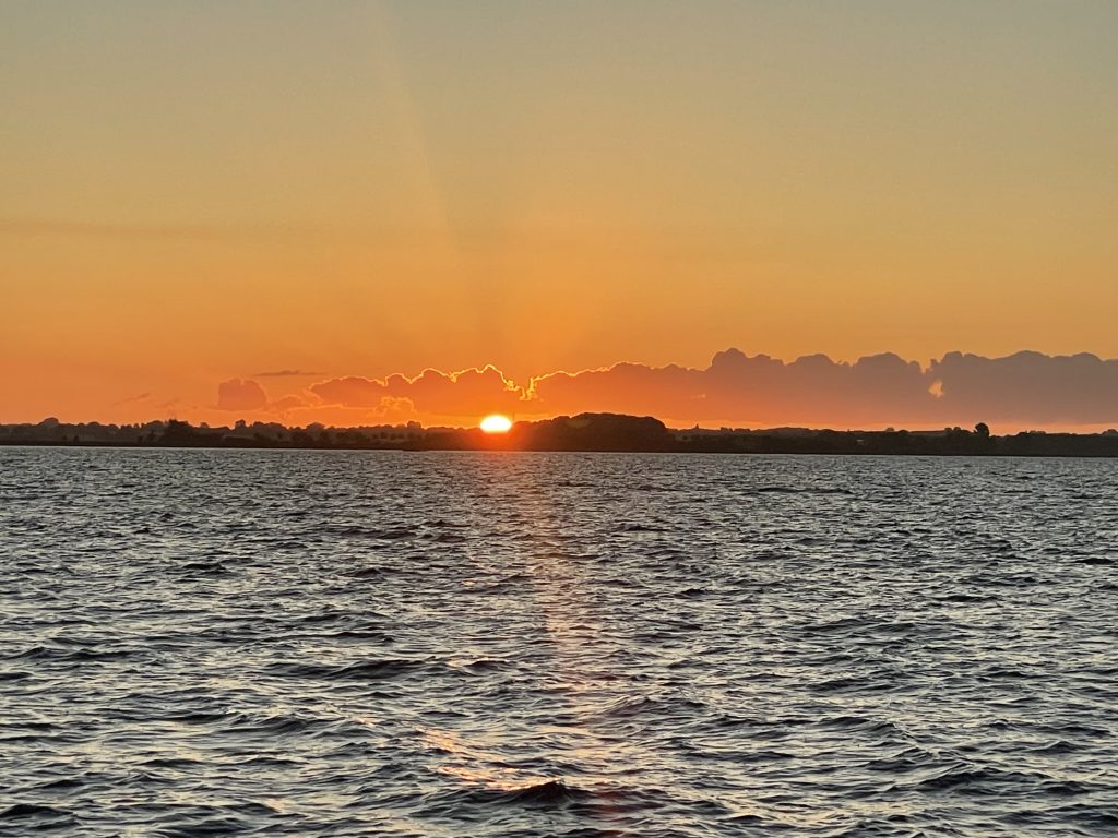 Am nächsten Morgen (Sonntag, der 17.08.25) paßt der Wind und alles klappt, wie geplant. Danke nochmal an Katja und Andreas (und ihre beiden Jungs) und weiter eine schöne Urlaubsreise. Und man glaubt es kaum: da hat doch tatsächlich jemand 10 Minuten vor uns abgelegt? …und fährt jetzt mit uns in den Sonnenaufgang (um 05.53h).