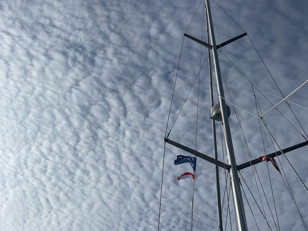Am nächsten Morgen lässt der Wind endlich nach – das stetige Heulen in den Wanten ist verschwunden und die See wirkt merklich ruhiger. Als wir aus der Koje klettern schwächelt die Sonne noch etwas und versteckt sich hinter Schleierwolken. Wir sind zwar wieder recht früh unterwegs, doch heute bei weitem nicht die Ersten. Bestimmt 5-7 Schiffe haben vor uns schon den Hafen verlassen. Alle Achtung. Nach einem dem starken Wind geschuldeten Ruhetag im Hafen werden alle ungeduldig und die gewählten Kurse der Schiffe gehen in die verschiedensten Richtungen. Und auch unserem Aufbruch steht nichts mehr im Wege. Und ganz bald ist dann auch die Sonne wieder voll auf der Höhe.