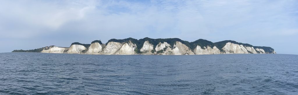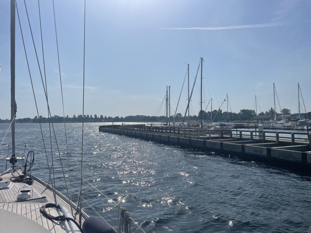 Wir passieren natürlich auch wieder die Kreidefelsen von Møns Klint, diesmal in der Sonne. Das ist auch das Zeichen, um uns langsam auf das Einlaufen in den Hafen vorzubereiten: Fender an der Reling befestigen – aber nicht außen Bords hängen, damit sie nicht zwischen den Dalben hängenbleiben! – und die Achter- und Vorleinen entsprechend klarieren.