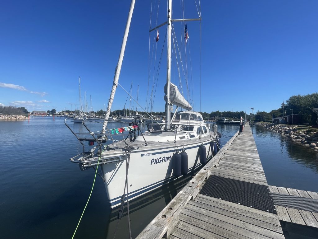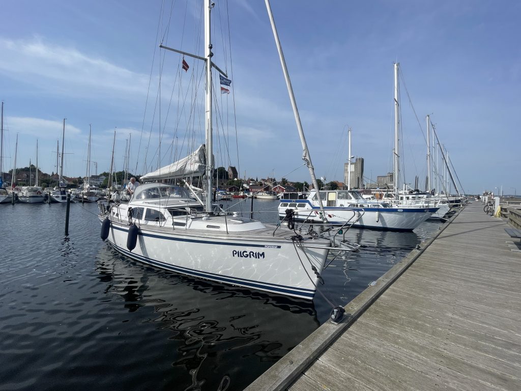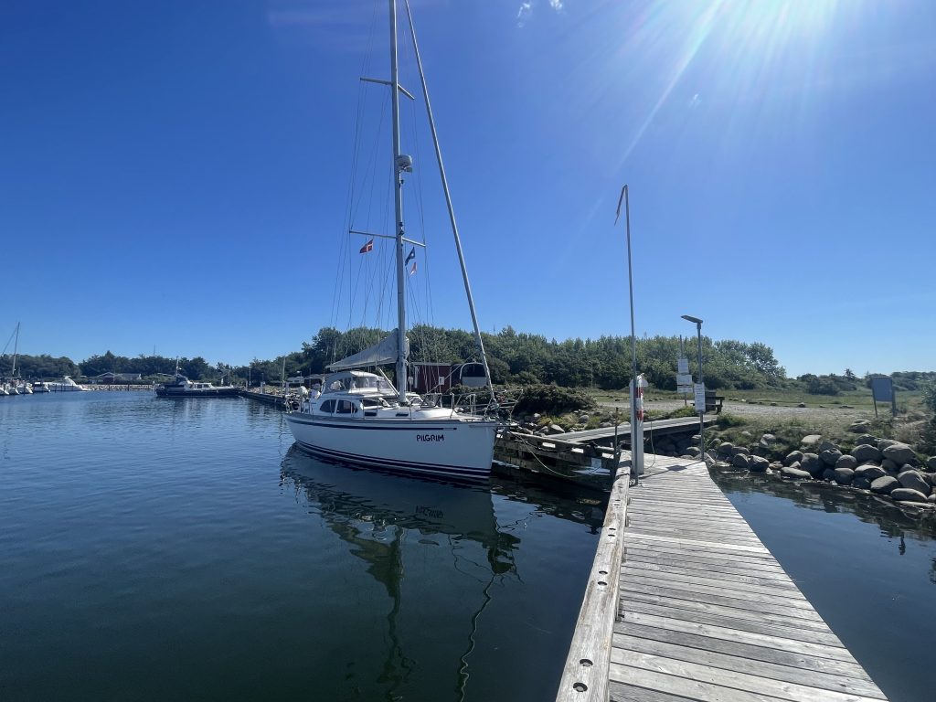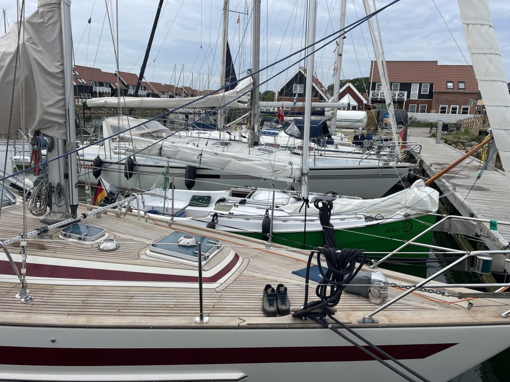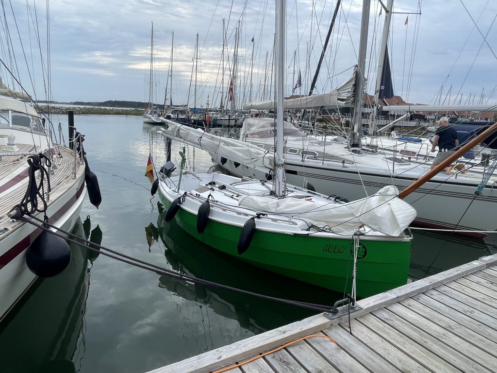 Als wir Klintholm erreichen, ist gaaanz viel Platz im Hafen. Das ändert sich im Laufe des Nachmittags, doch es wird – gefühlt – nicht ganz so voll, wie vor drei Wochen. Und als wir grad festgemacht haben, legt sich „Marilyn“ neben uns – unser netter Bug-zu-Bug-Nachbar aus Skanör. Er lag hier im Hafen schon eine Nacht längsseits an einem Steg, doch jetzt sind Boxen frei und er wechselt lieber.