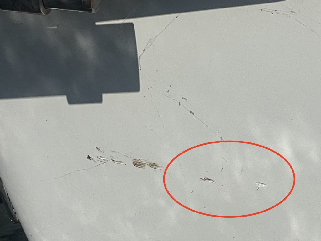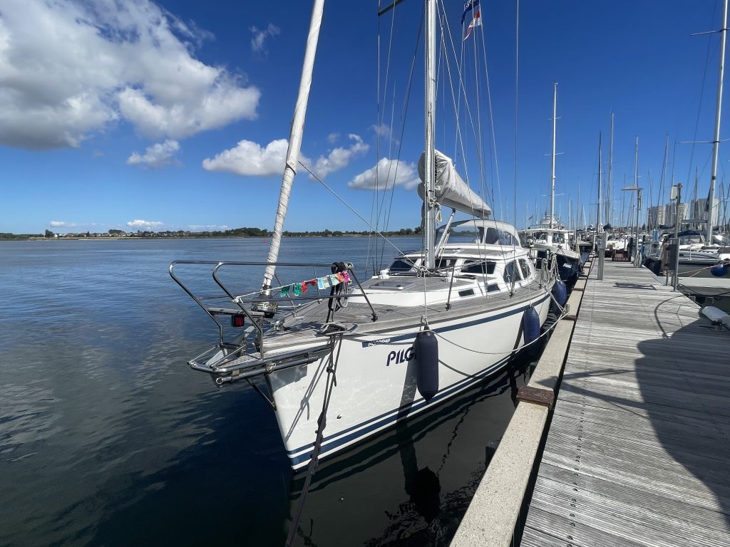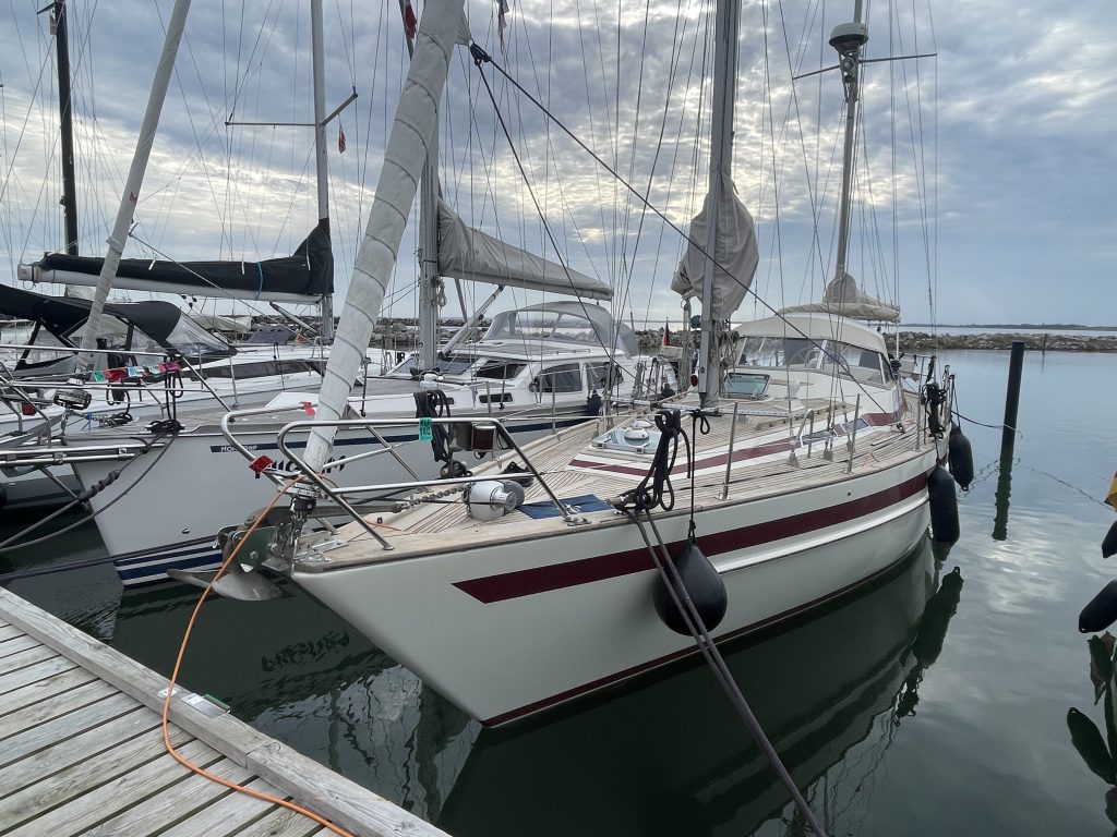 Beim Anlegen bekleckern wir uns beide nicht gerade mit Ruhm. Ergebnis: ein Kratzer am Bug. Mist! Damit ist der erste Punkt auf der Liste für auszuführende Arbeiten im Winterlager notiert 🫤. Ich hänge die Fender nicht weit genug nach vorne, Kalli fährt die Pier etwas zu spitz an, die Vorleine als Spring hätte lieber auf der Mittelklampe liegen sollen und das Bugstrahl ist gedanklich schon nicht mehr in Kallis Kopf (obwohl es ja immer noch einmal funktioniert) und zack… die Pier hat zugebissen. Mit etwas zu viel Schwung dittschen wir gegen die Pier und natürlich genau an der Stelle, an der an der Wand kein Gummipuffer, sondern eine Eisenverbindung ist. Manchmal läuft’s einfach nicht rund – trotz jahrelanger Erfahrung – und wenn es blöd kommt, gesellt sich zum Missgeschick auch noch das Quäntchen Pech.