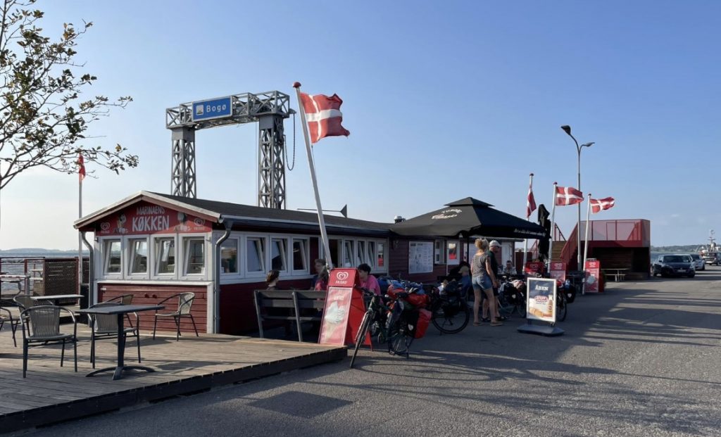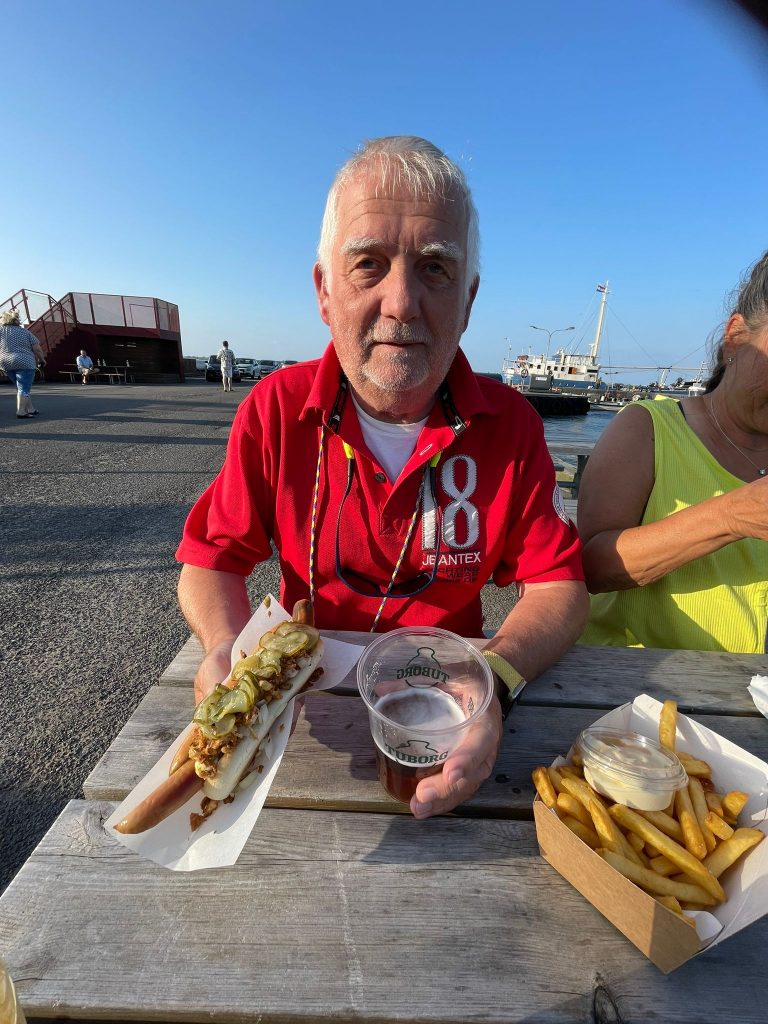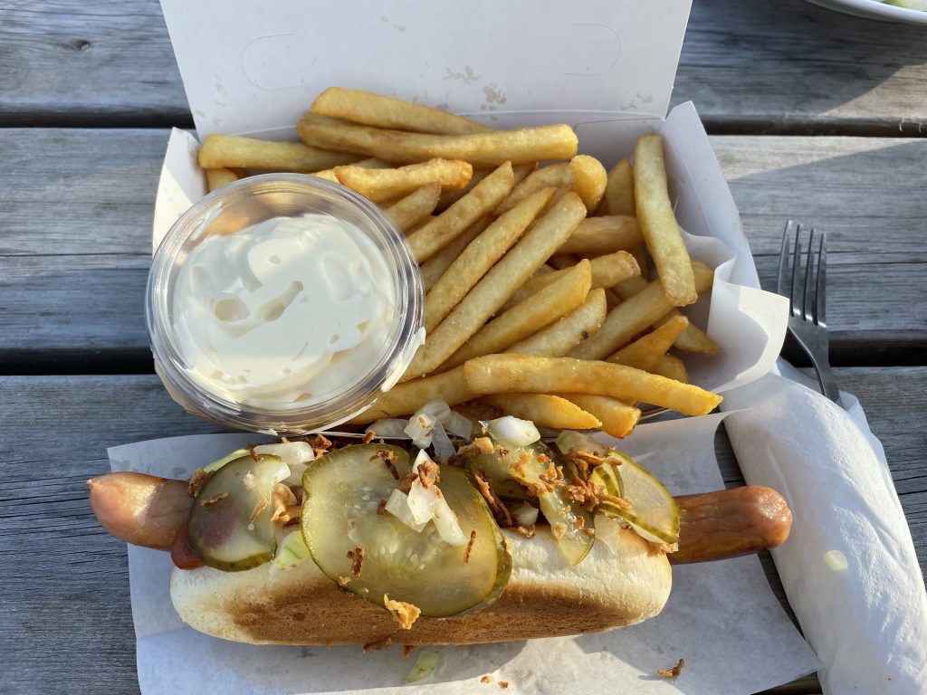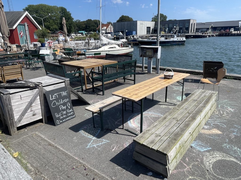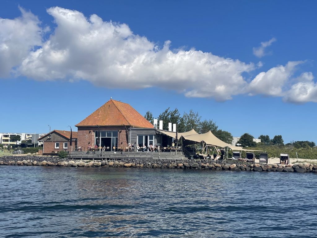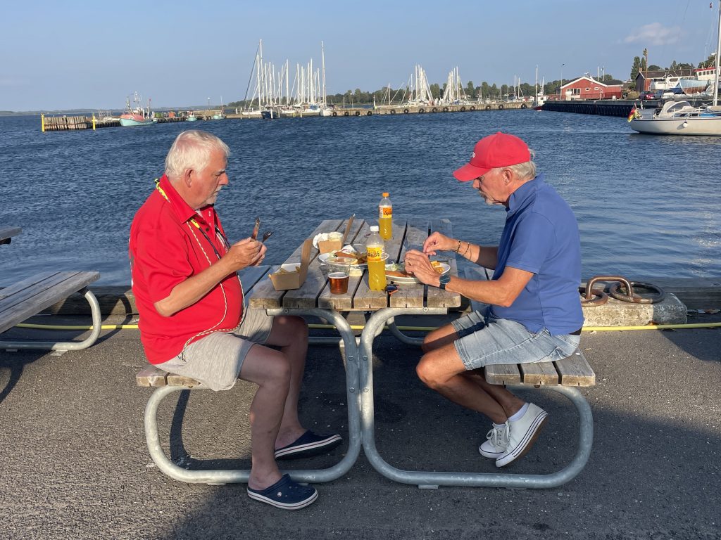 Dann aber gemütlich zurück zum Schiff. Wir genießen die strahlende Sonne bei immer noch stürmischem Wind… und abends endlich mal ein typisch dänisches Abendessen. Wir besuchen „das erste Restaurant am Platz“ 🥴 – ich weiß garnicht, ob es überhaupt noch ein anderes Restaurant in Stubbekøbing gibt – und bestellen unseren ersten „Ristet Pølser“. Kann eigentlich nicht wahr sein, dass wir erst hier unser erstes dänisches Grillwürstchen der Saison bekommen. Ist lecker – wie erwartet!