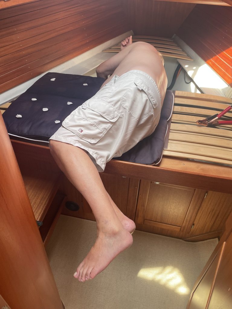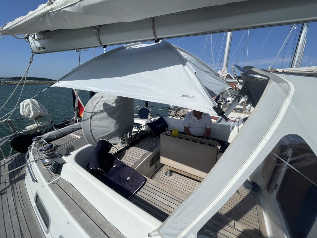 Endlich mal wieder kurze Hose… und Sonnenschutz über dem Cockpit aufbauen – wie auch schon einmal in Skanör. Beim Aufbau unseres Sonnensegels werden wir inzwischen immer schneller und haben auch verschiedene Anbinde-Varianten ausprobiert. Die beste Variante: Großbaum beiseite schwenken und das Sonnensegel (ist ja eher ein Schattensegel🧐) hoch genug binden, damit auch noch Wind drunter kommt und man nicht immer geduckt darunter her kriechen muss. Das haben wir jetzt raus, Kalli sitzt im Schatten und ist happy.