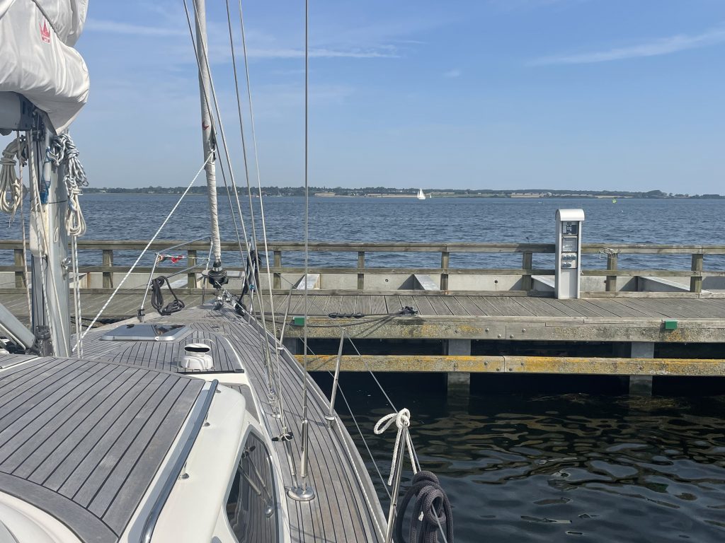 Der Hafen von Gedser ist nur locker gefüllt. Diesmal wählen wir als Platz keine Box, sondern einen Längs-Liegeplatz. Der hat zwar den Nachteil, dass wir eventuell einen Nebenlieger bekommen könnten, aber die Chance ist relativ gering. Der Längs-Platz hat aber für uns den Vorteil, dass wir dort bei jeder Windrichtung auch ohne Bugstrahlruder gut ablegen können. Wir müssen nur einige bei den meisten etwas in Vergessenheit geratene Manöver – in die Spring fahren – anwenden, dann geht das auch ohne Bugstrahlruder. Wie früher.