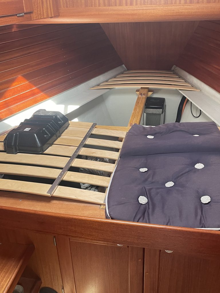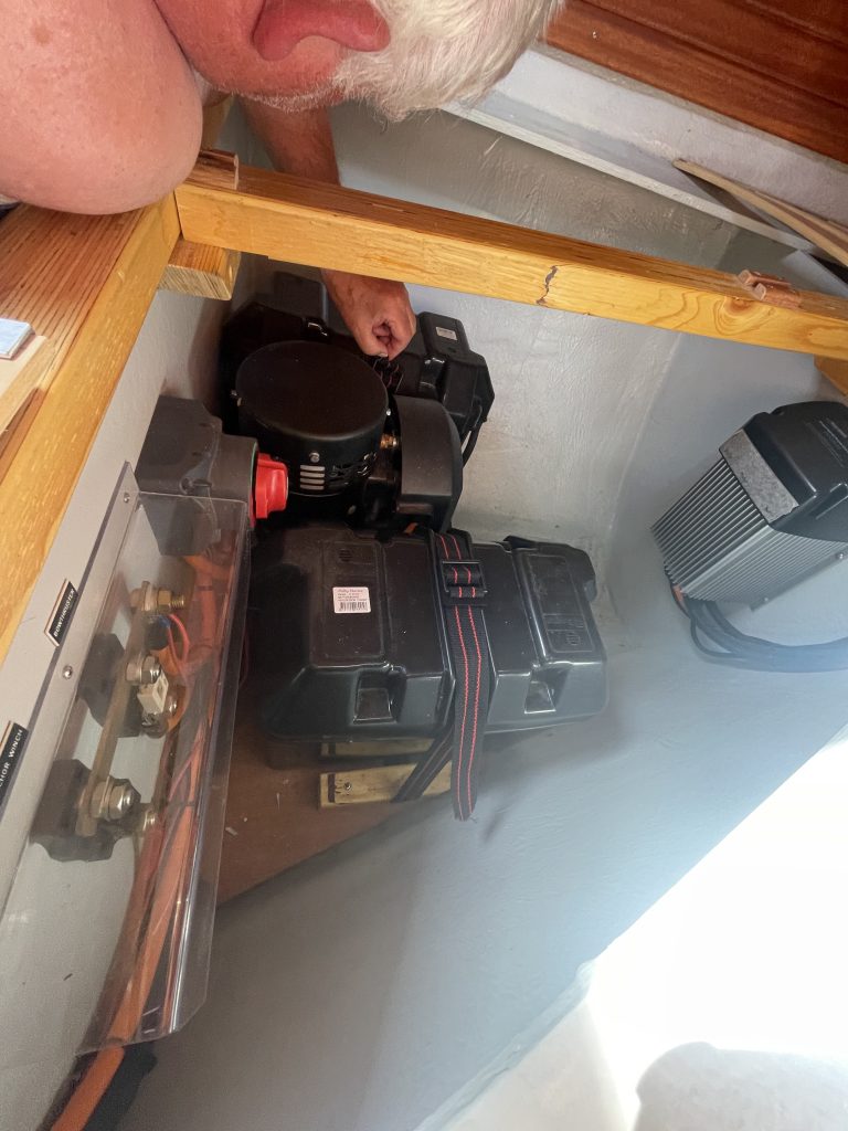 Sogleich nach dem Festmachen wird die Ursache erforscht. Kalli kriecht ins Vorschiff, wo die beiden Batterien verbaut sind. Wir haben ein kräftiges 24V-Bugstrahlruder, daher benötigen wir zwei 12V-Batterien, die dann in Reihe geschaltet sind. Bewaffnet mit einem Batterie-Testgerät, welches nicht nur Ladung, sondern auch Leistung testen kann (was man so alles mit sich rum schleppt 🥴) werden die „Herztöne“ abgehört. Und siehe da: eine Batterie ist tot und die andere schlecht drauf. Warum kündigt sich das eigentlich nicht vorher an? Wobei… bei intensiverem Nachdenken meint Kalli, dass er schon bei den letzten An- und Ablegemanövern vom Bugstrahlruder nicht die volle Power abrufen konnte. Und nun haben sie endgültig ihren Dienst quittiert. Das sei ihnen nach über 12 Jahren treuer Arbeit auch gegönnt, aber genau jetzt? Das Problem hätte sich doch auch gerne gleich am Anfang der Saison zeigen dürfen – so wie mit der Batterie vom Heckstrahlruder. Sozusagen ein Aufwasch. Jetzt trübt diese Panne irgendwie die Reisefreude.