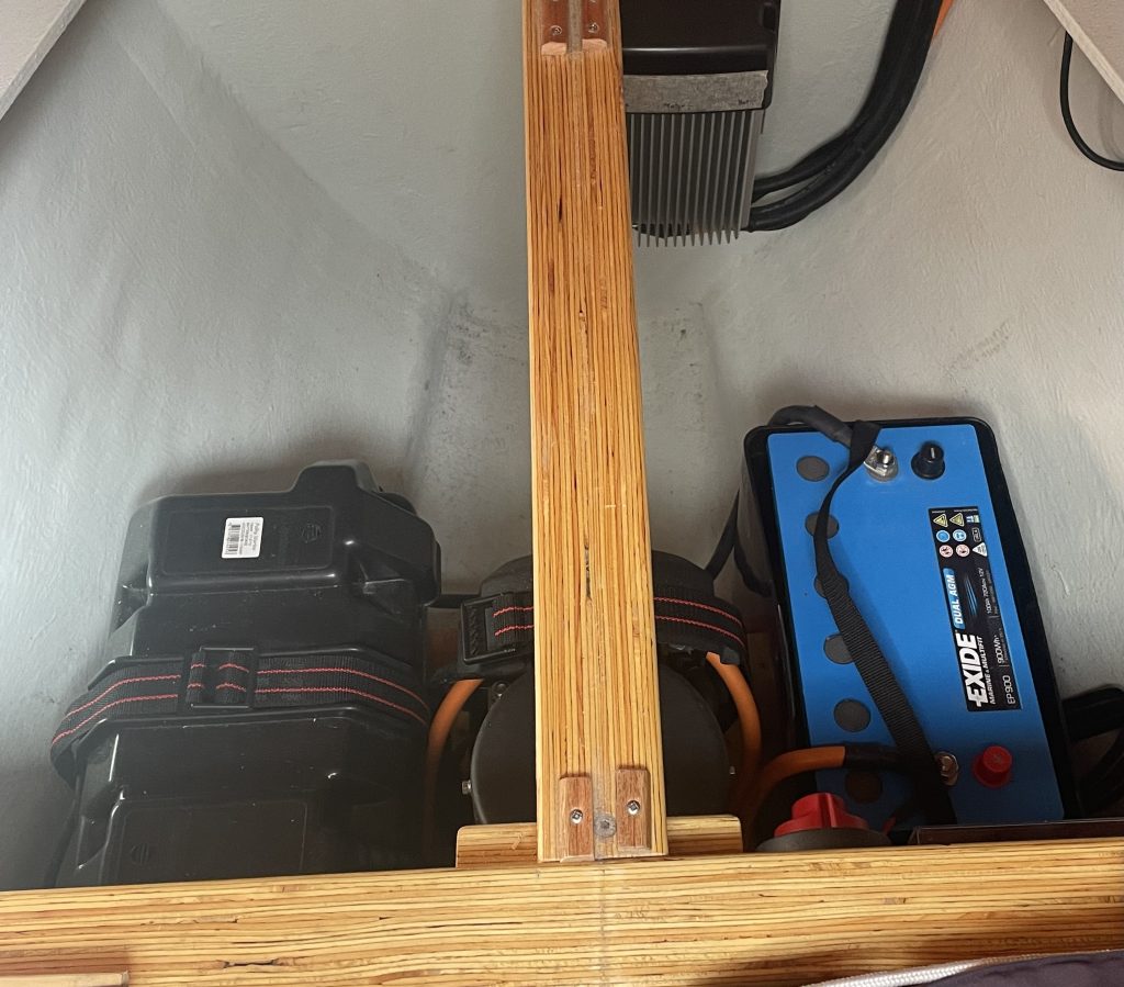Aber genau im passenden Moment sorgt ein Lichtblick für neue positive Energie: Mathias kündigt sich an und kommt mal wieder ins Dänen-Land! Kaum hat er unser Problem vernommen, bietet er prompt an, neue Batterien mitzubringen. Eine wilde Telefon-Odyssee beginnt, um die passenden Modelle aufzuspüren. Doch leider… das ist garnicht so einfach. Es müssen spezielle Batterien sein, die über kurze Zeit viel Power abgeben können. So weit, so gut. Dann müssen sie aber natürlich auch in die vorhandenen Schutzkästen passen und zu guter Letzt müssen auch die Anschlüsse in Art und Position zu den Anschlusskabeln passen. Letztere erlauben nämlich nicht viel Spiel. Müssen leider überall erst bestellt werden, also nichts mit Bringeservice.