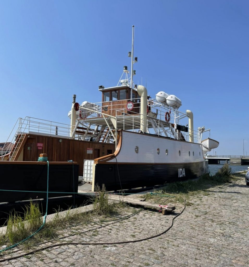 Auch die historische Fähre „Ida“ entdecken wir. Normalerweise transportiert sie Fußgänger, Radfahrer und einige Autos von Stubbekøbing auf die gegenüberliegende kleine Insel Bogø, doch aktuell liegt sie mit einem technischen Defekt hier in Stege in der Werft. Auch bei den Profis geht mal was kaputt.