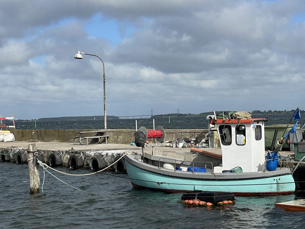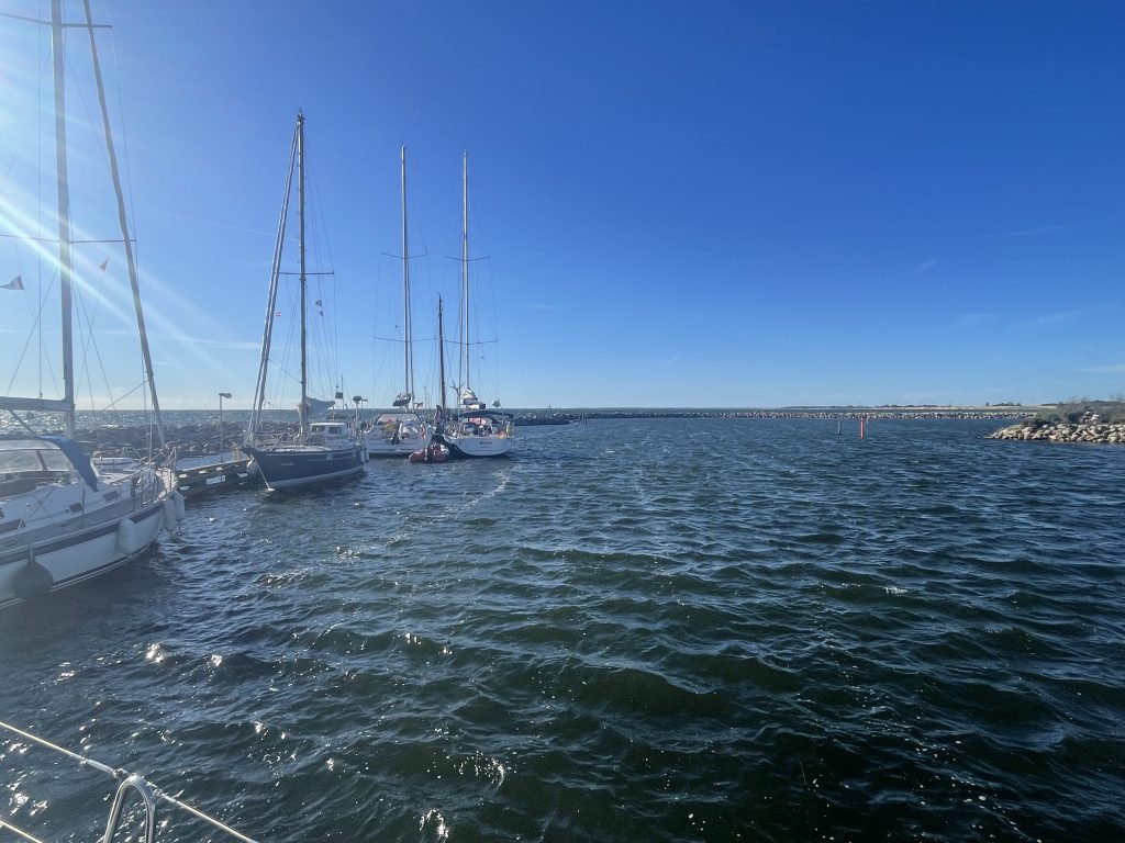Wecker mal wieder um 06.00 Uhr🫨, Ablegen geplant für 07.00 Uhr. Immer wieder pfeifen Böen heftig durch die Wanten und einige Leinen schlagen – dong dong dong – gegen die Masten. Nicht bei uns, unsere Leinen sind gut abgespannt, aber irgendeiner vergisst immer irgendeine Leine 🤷♀️. Trotz der guten Vorsätze des Vorabends bleibt das Ablegen aus – umdrehen und noch etwas weiterschlafen. Statt Hektik am Morgen herrscht stilles Einverständnis: wir bleiben noch einen Tag. Der Wind hat das letzte Wort. Selbst für den von mir immer viel gerühmten dänischen Wetterbericht ist es aktuell schwierig, bei den schnellen Wetteränderungen die korrekten Vorhersagen zu treffen. Gestern Abend sah das nämlich noch ganz anders aus. Erst einmal ist das Ablegen aber auf den nächsten Morgen vertagt.