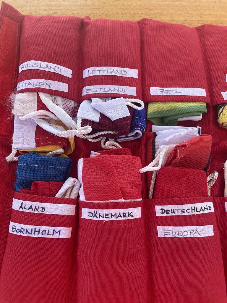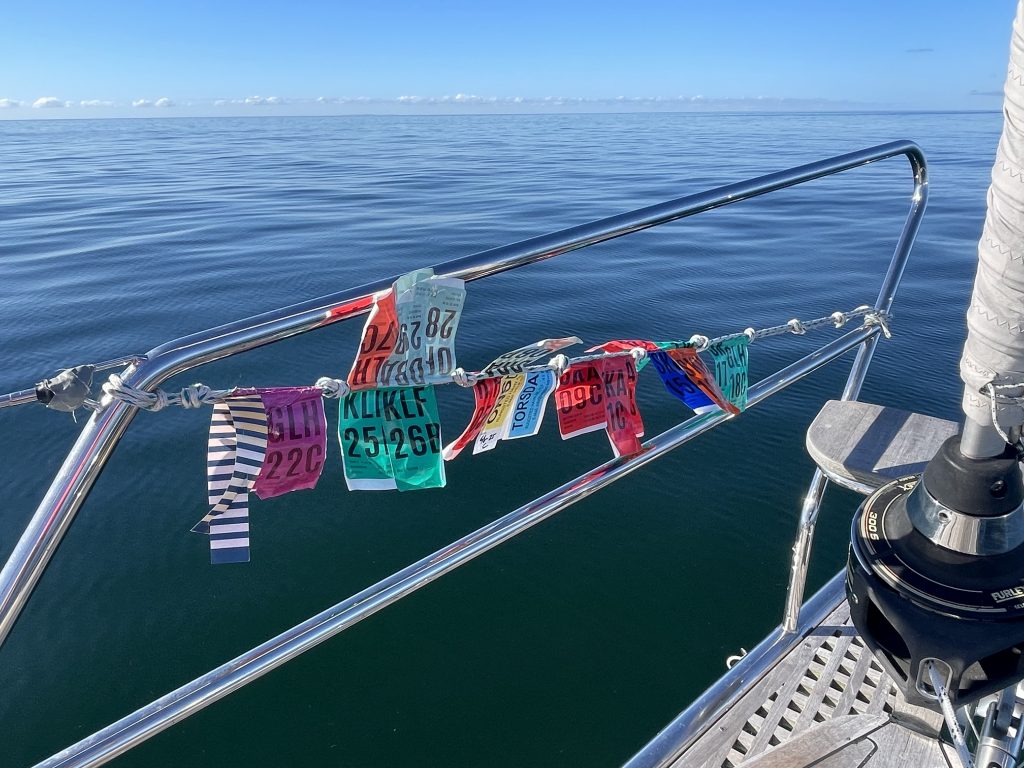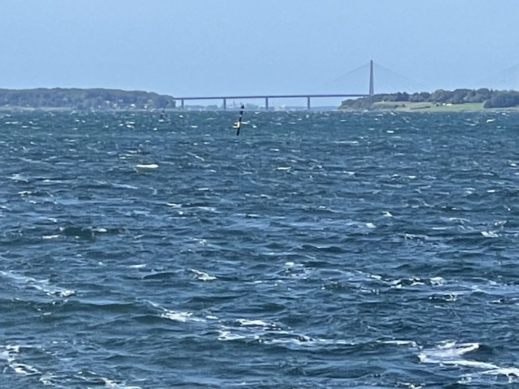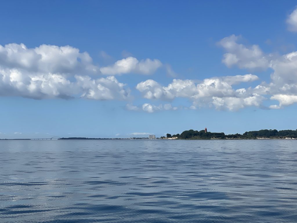 Wir nutzen die Zeit für verschiedenen Telefonate. Ganz wichtig als erstes: Zurückmelden im Heimathafen Grömitz. Dort hatten wir unseren Liegeplatz bis Ende August für Gäste freigegeben, doch jetzt brauchen wir ihn selber. Und dann natürlich die Suche nach einem guten Preis für die benötigten Batterien. Und einem Termin zum Austausch. Klappt alles und so tuckern wir gemächlich gen Fehmarn, aber nicht, ohne beim Überfahren der Ländergrenze die dänische Gastlandflagge einzuholen.