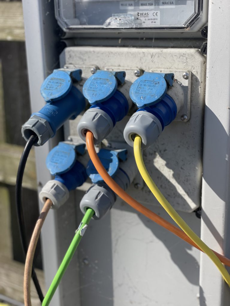 Beim Anlegemanöver erwacht plötzlich ein Getriebe-Kobold-Nachkomme zum Leben: unser Bugstrahlruder fällt aus. Es macht noch einmal das bekannte brummende Geräusch – wir haben ordentlich Seitenwind und es sollte doch lieber arbeiten – dann schweigt es beharrlich. Mal was Neues… aber irgendetwas ist ja immer🤷♀️. Wir sind aber schon dicht genug am Steg – na gut, etwas schräg, aber egal – ich werfe eine Vorleine an Land, treffe die Klampe und kann uns in die richtige Position ziehen. Kalli hilft mit dem Heckstrahlruder noch etwas nach. Also auch ohne Bugstrahlruder gut angelegt. Rechts und links ist niemand da, wir haben viel Platz, doch in engen Hafenbecken sieht das dann schon anders aus und mit unserem doch recht hohen Aufbau und dem Schiffsgewicht ist es ohne Unterstützung des Bugstrahls schon manches Mal eine Herausforderung.