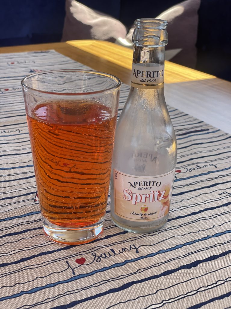 Immerhin haben wir einen schönen Platz mit herrlicher Sicht auf den Burger Binnensee… und genehmigen uns heute mal einen etwas kräftigeren Einlaufdrink – zur Ärgerbekämpfung.