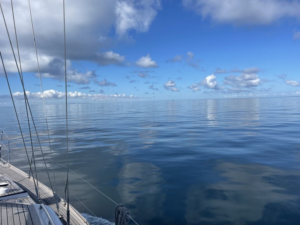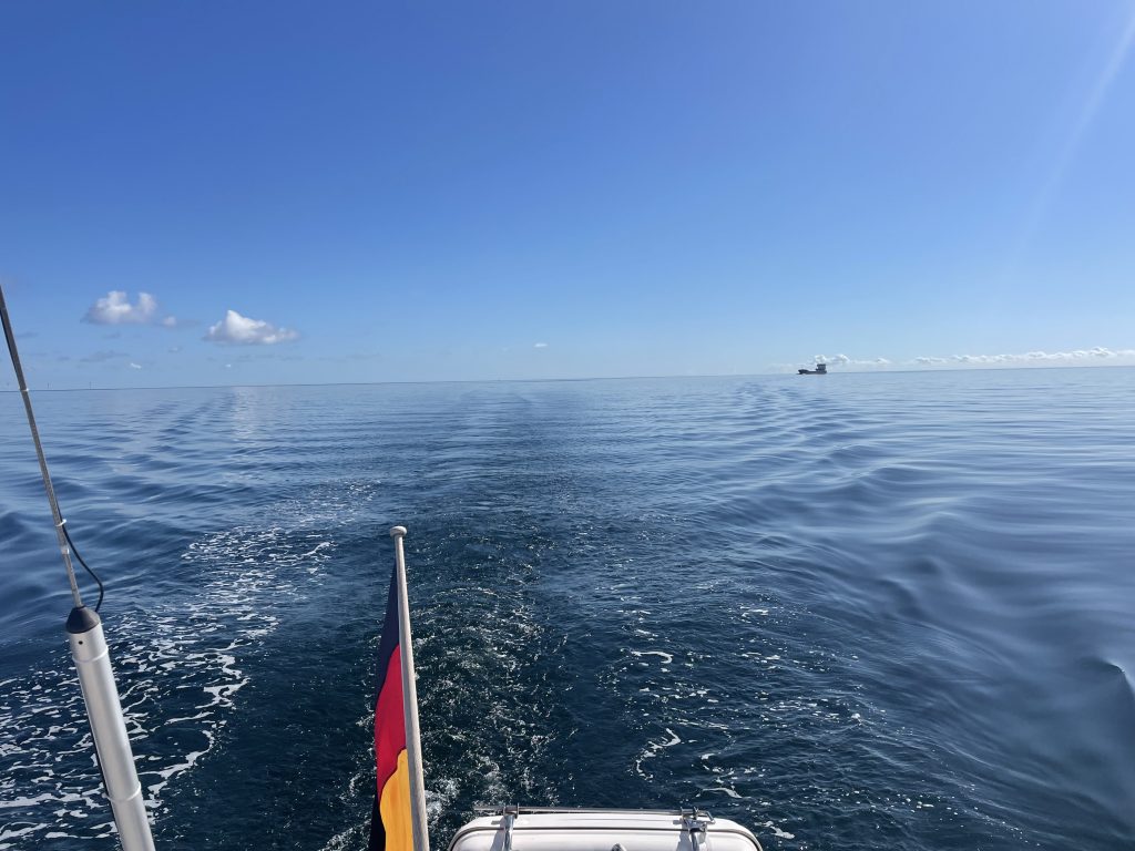 Ein neuer Morgen… immer noch wenig Wind. Die Fahrt nach Burgtiefe auf Fehmarn wird folglich kein Segeltrip – leider. Unsere Fahrt zurück in deutsche Gewässer erfolgt per Motorkraft. Unterwegs ist die See spiegelglatt. Das Wasser erscheint fast wie poliertes Glas und nicht die kleinste Brise kräuselt die Oberfläche. Das Wasser wirkt beinahe ölig… ganz glatt und ruhig. Nur unsere Fahrspur unterbricht die spiegelnde Fläche und verliert sich am Horizont… wie die großen Frachter, deren Weg wir kreuzen.